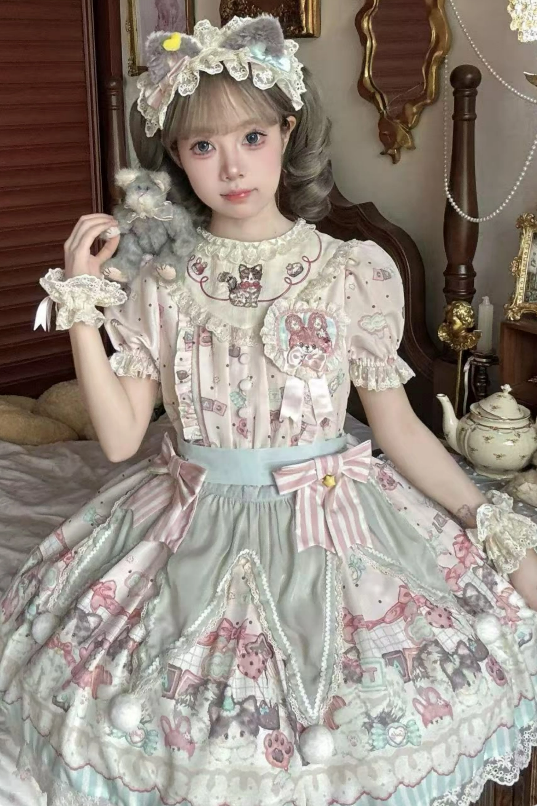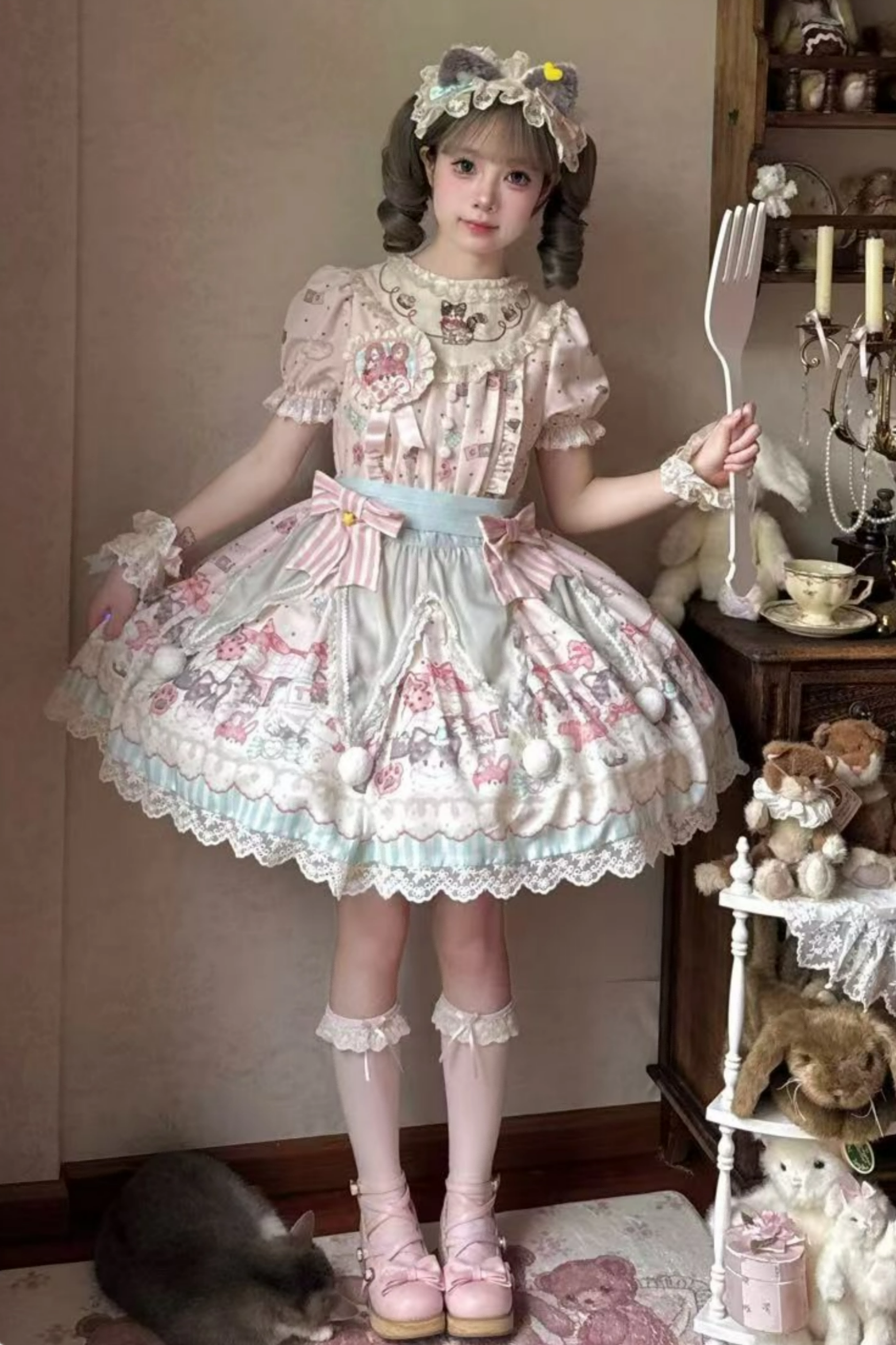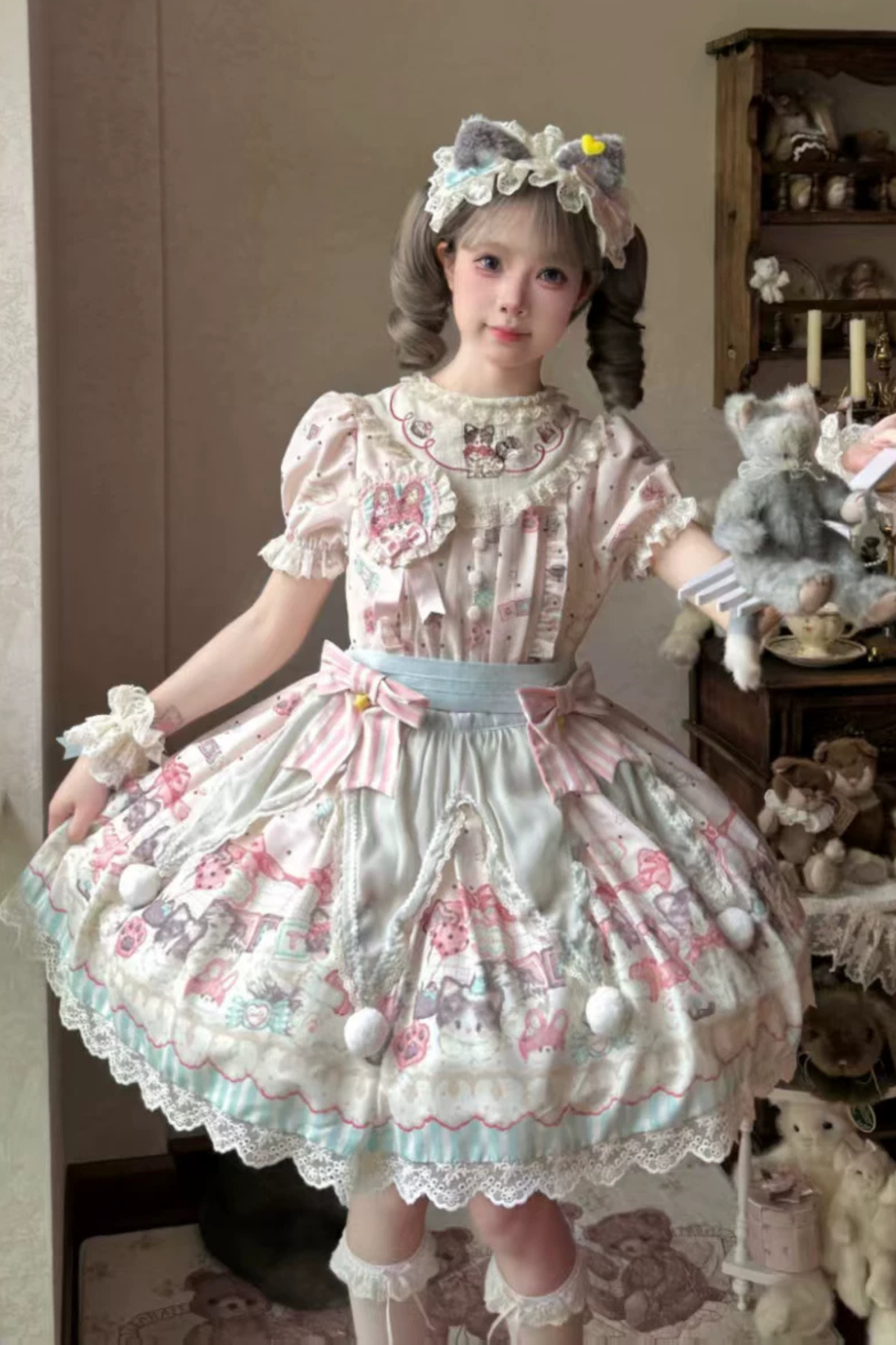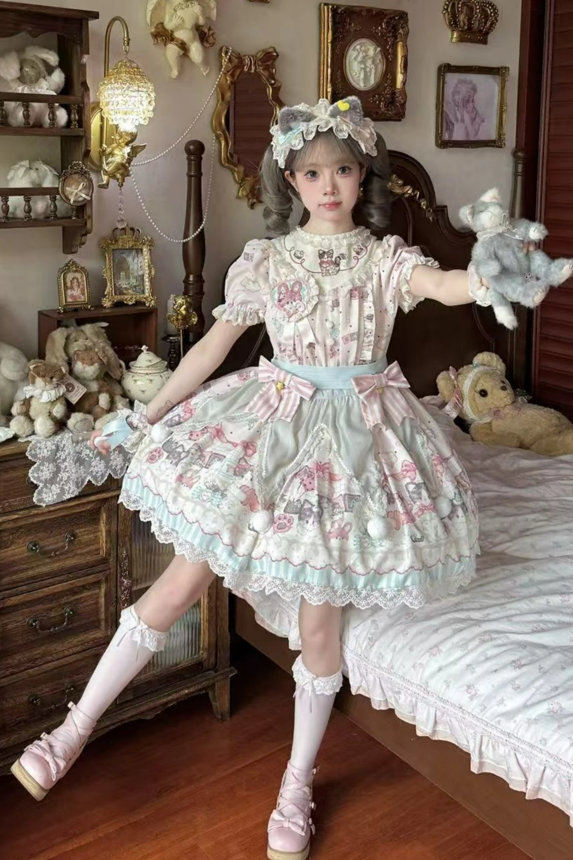 キャビネットロリータジャンパースカート+ドレス+ブローチ+ヘアバンド+ボンネット+エプロン+ハンドスリーブ