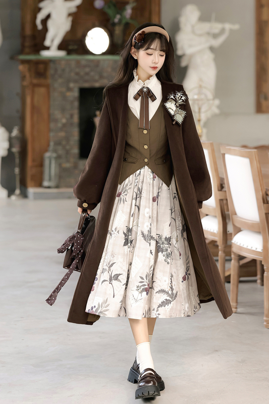 Retro Flower Design Cloak + Check Skirt + Shirt