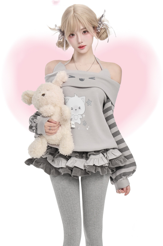 Striped One-Line Shoulder Halter Neck Top + Skirt