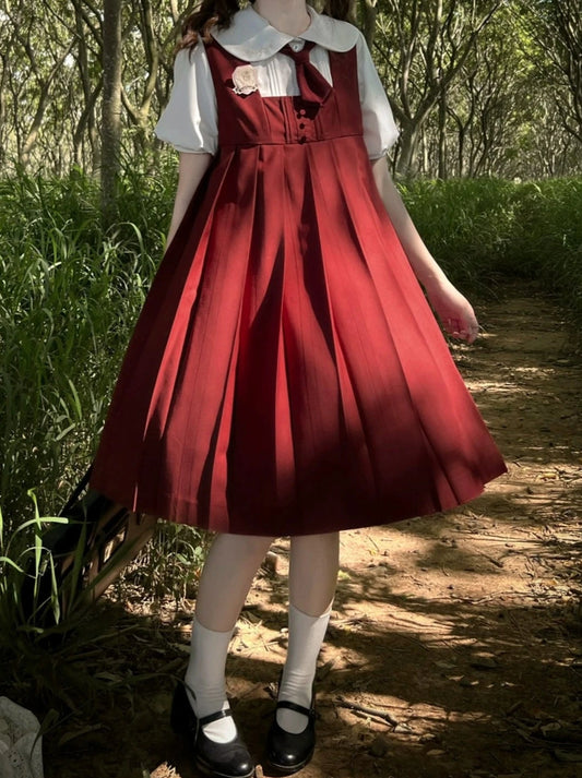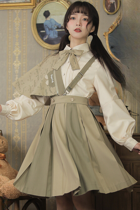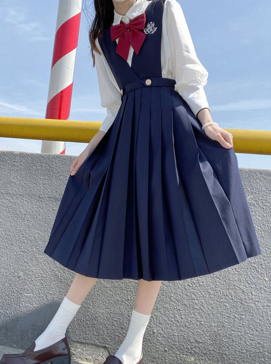 College Style Cream Chiffon Inner Shirt + V-Neck Vest Skirt + Ribbon Accessories [Reserved Item].
