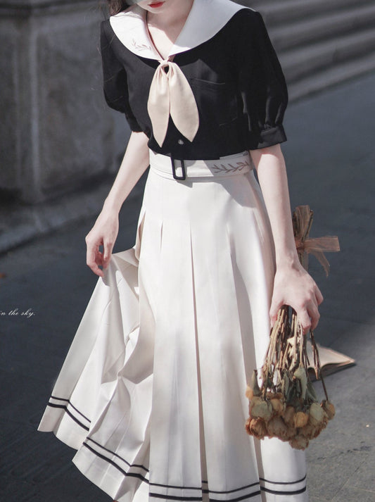 Retro French Elegant Sailor Collar Puff Sleeve Shirt + Box Pleated Skirt + Bunny Ear Tie [Reserved Item