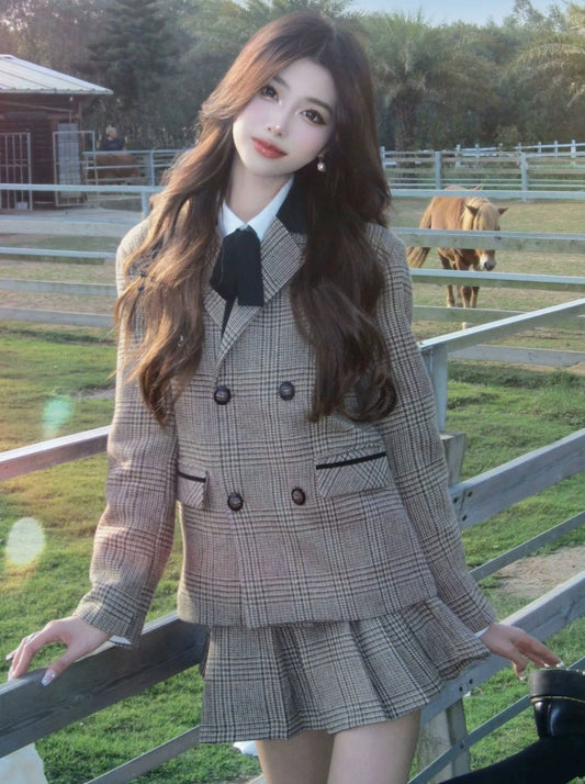 College Badge JK Blazer + White Shirt + Gray Hip Skirt