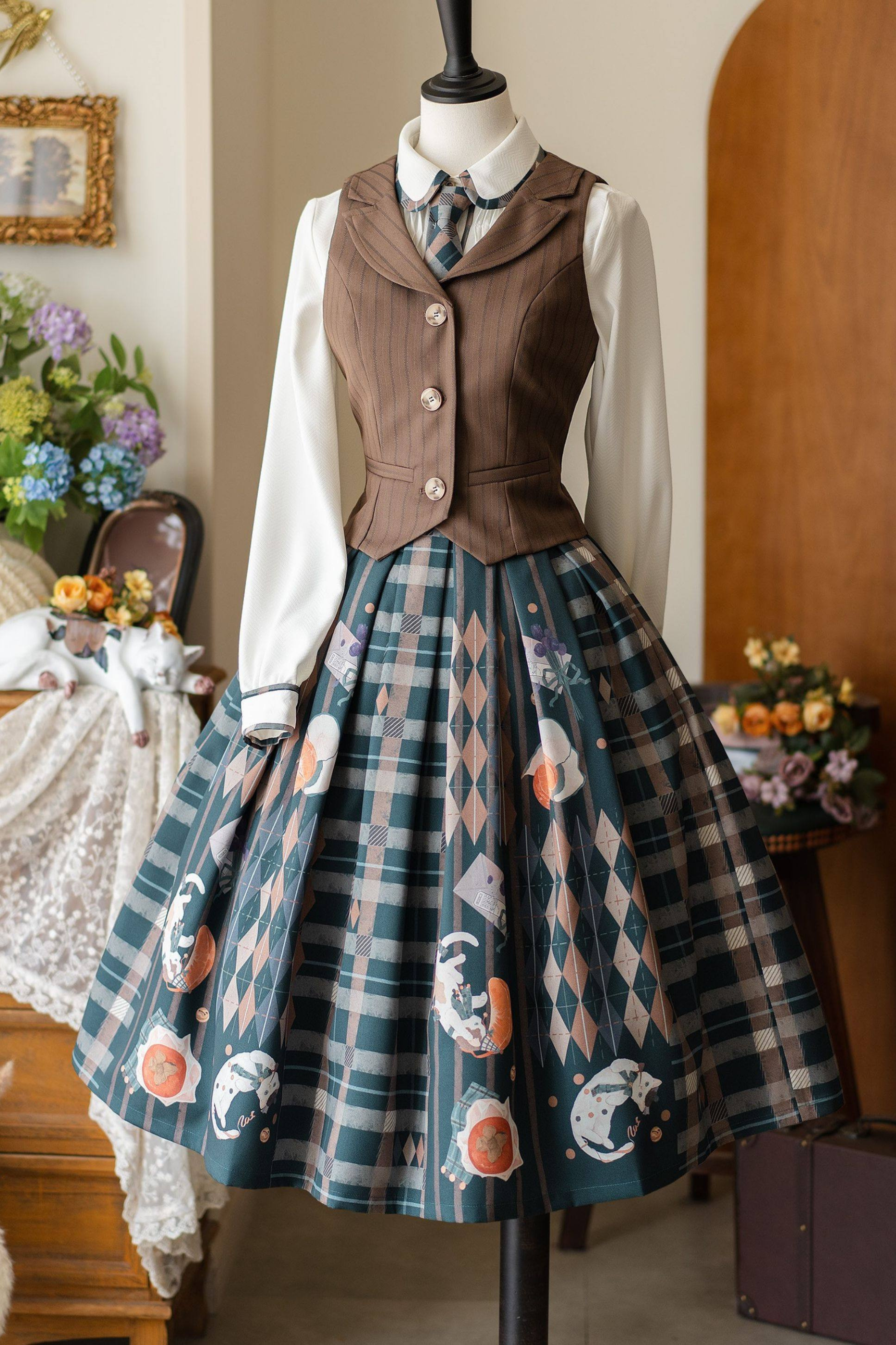 Retro Classic Forest Academy Shirt + Vest + Check Skirt
