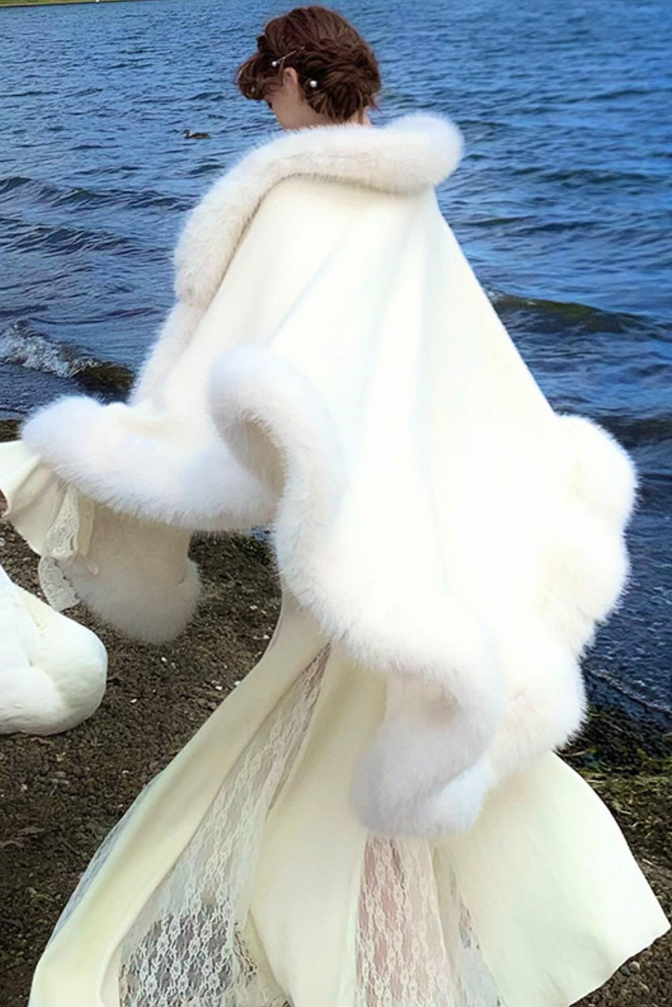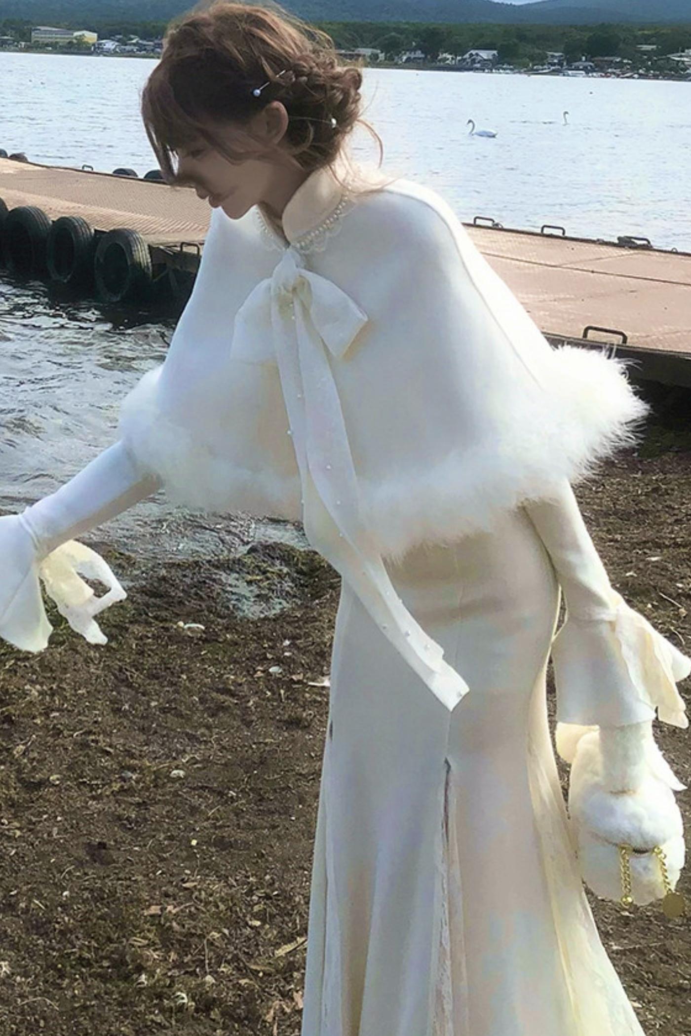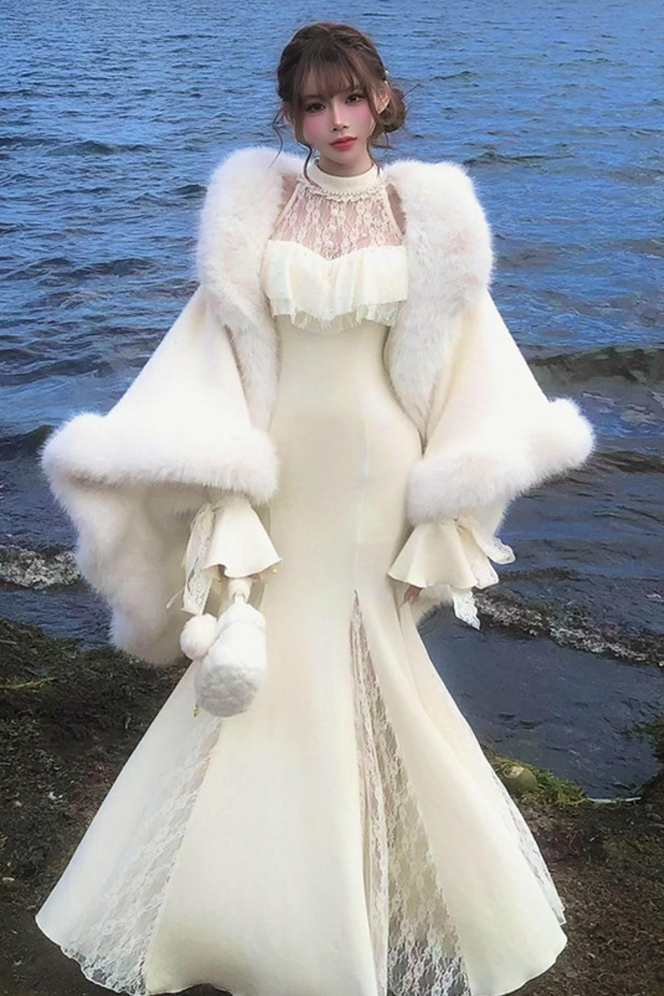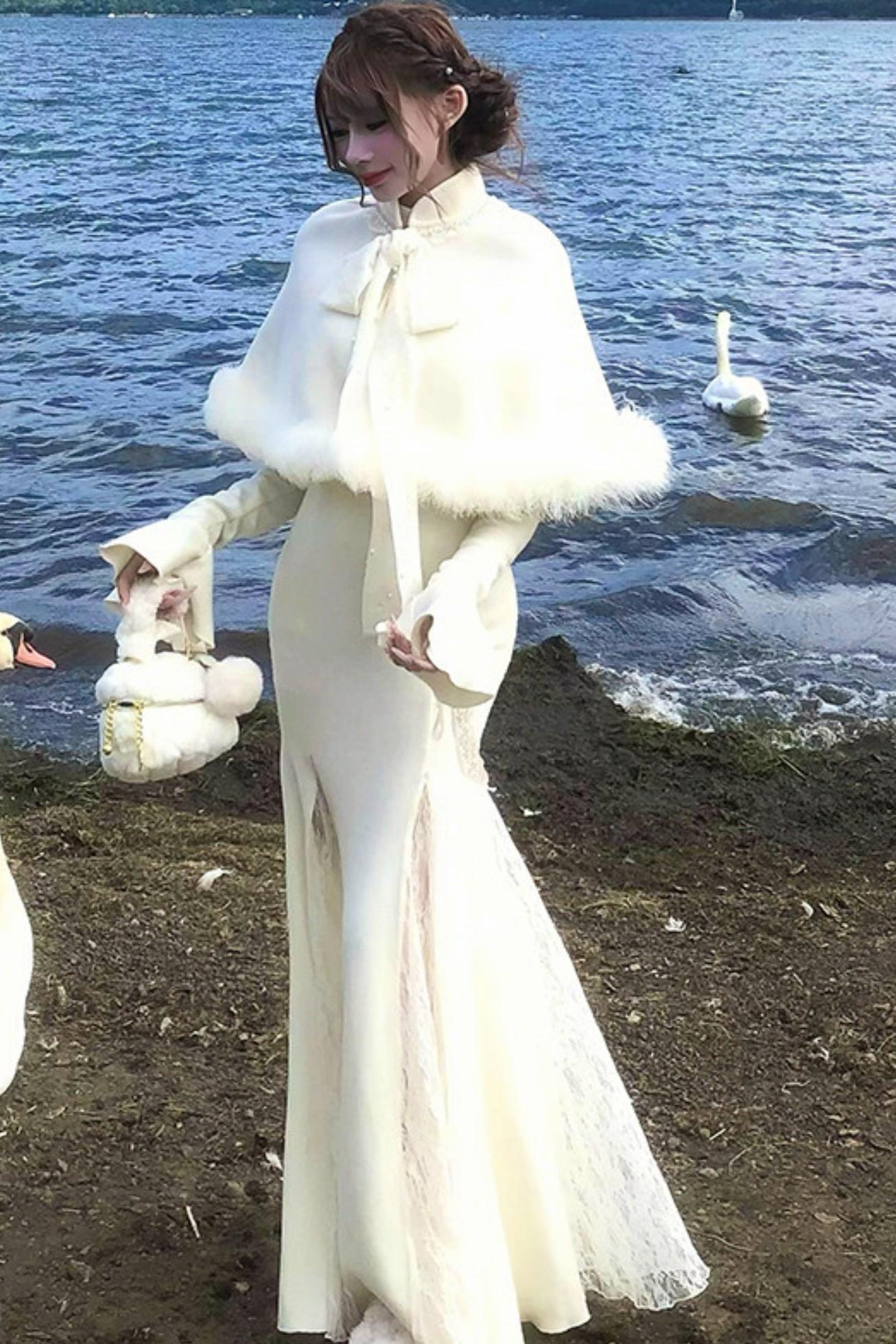 ❤French Lace Waist Slimming Dress + Soft White Longline Cloak ❤
