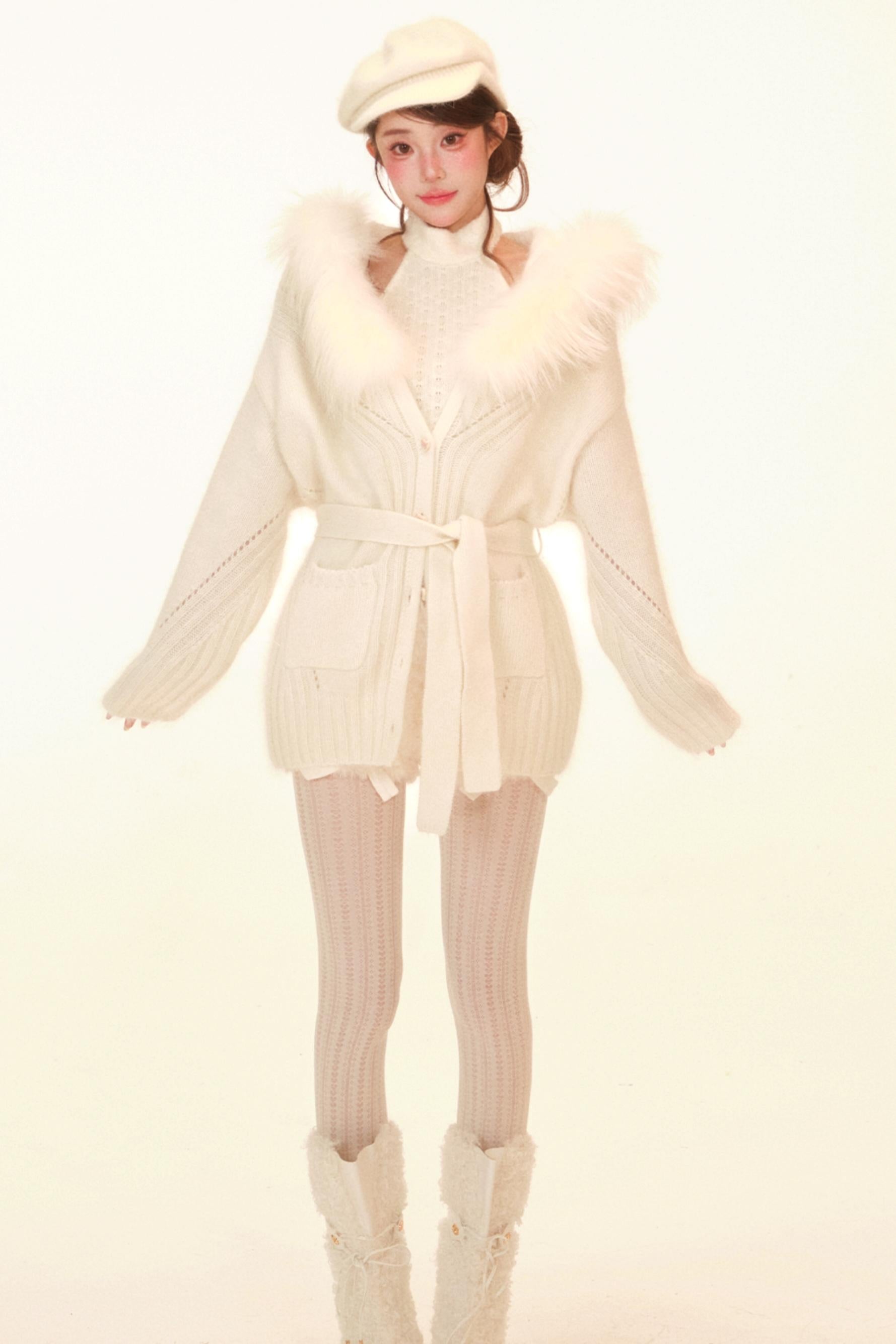 Halter Neck Fuzzy Knit Jacket + Top + Pants
