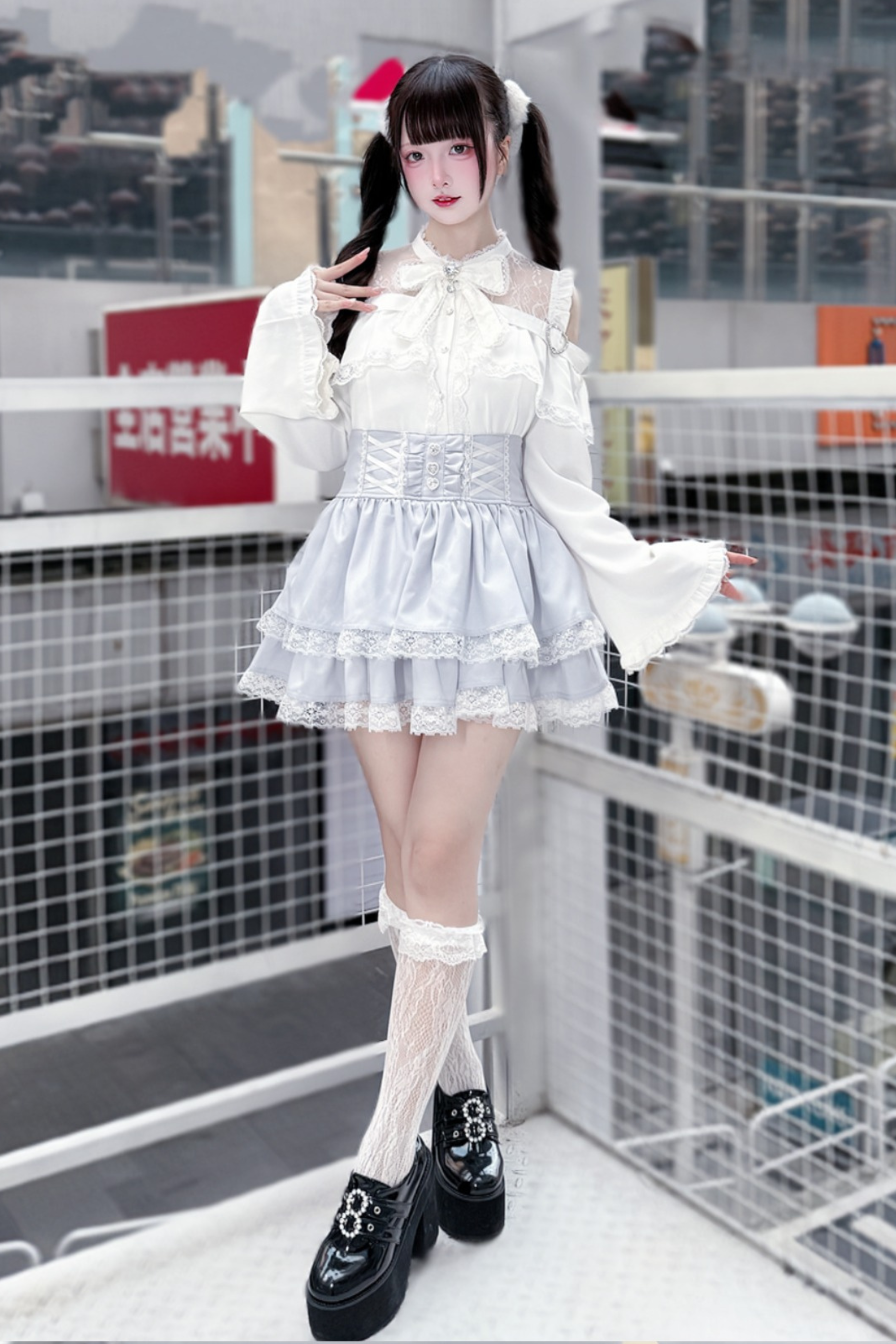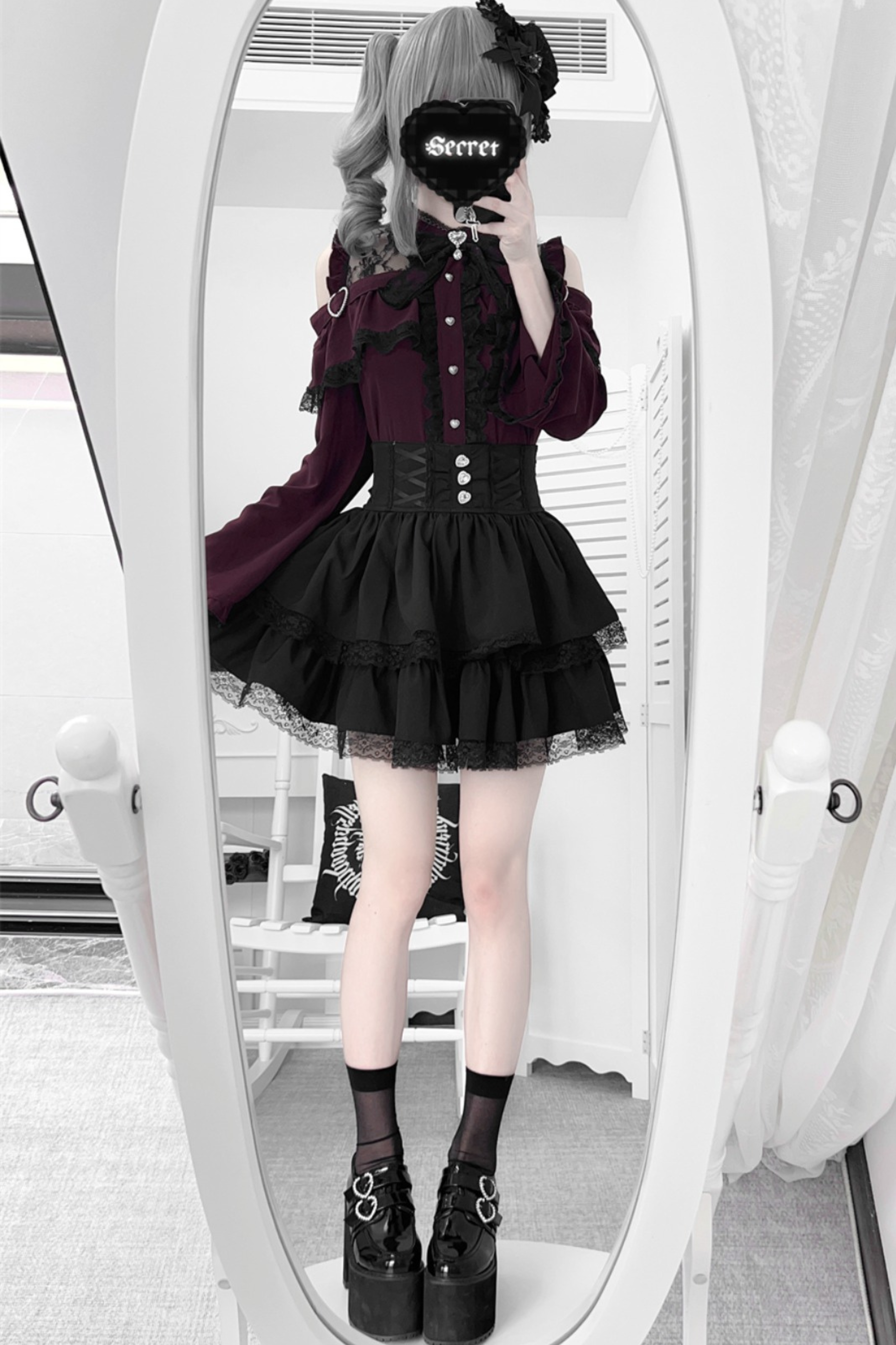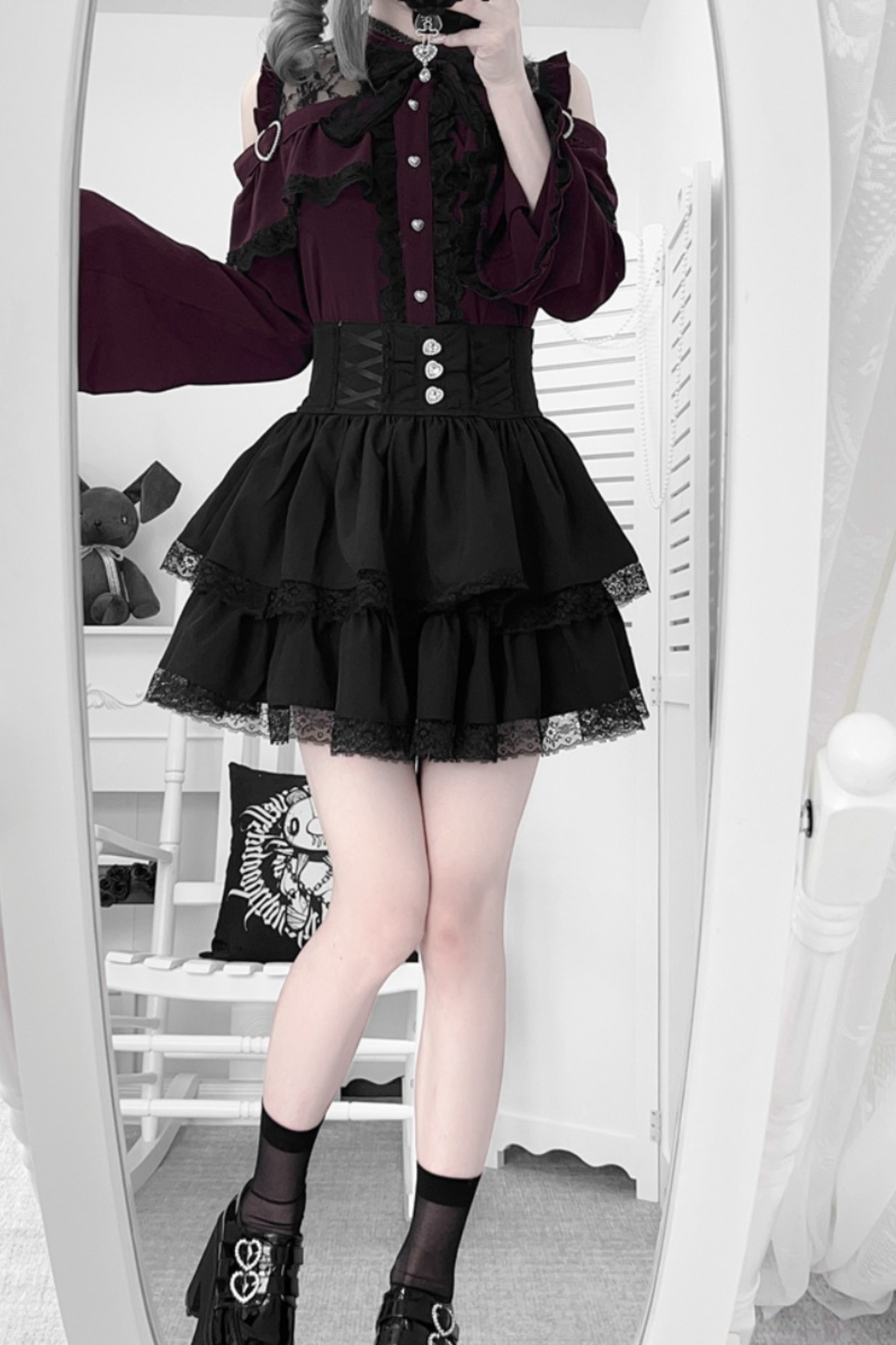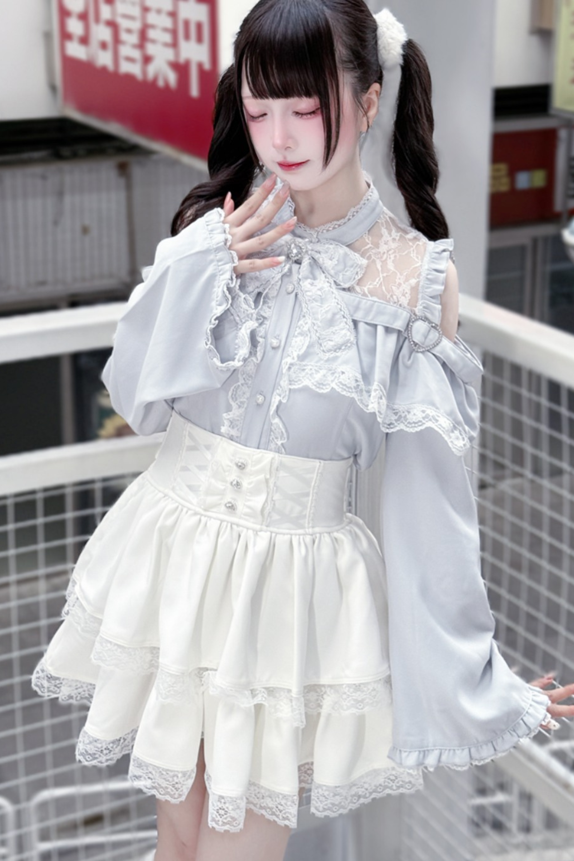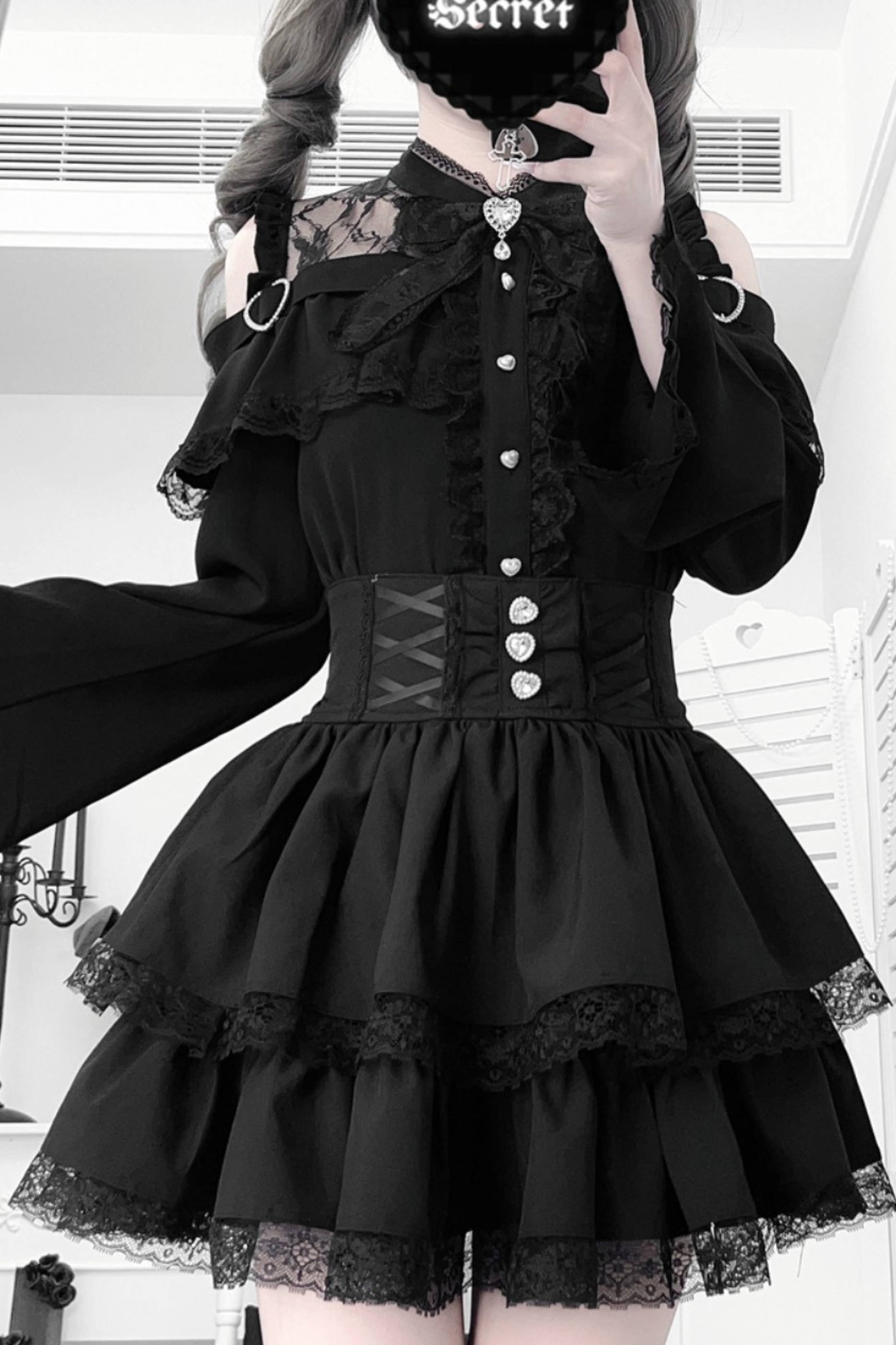 Lace off-the-shoulder shirt + lace-up skirt