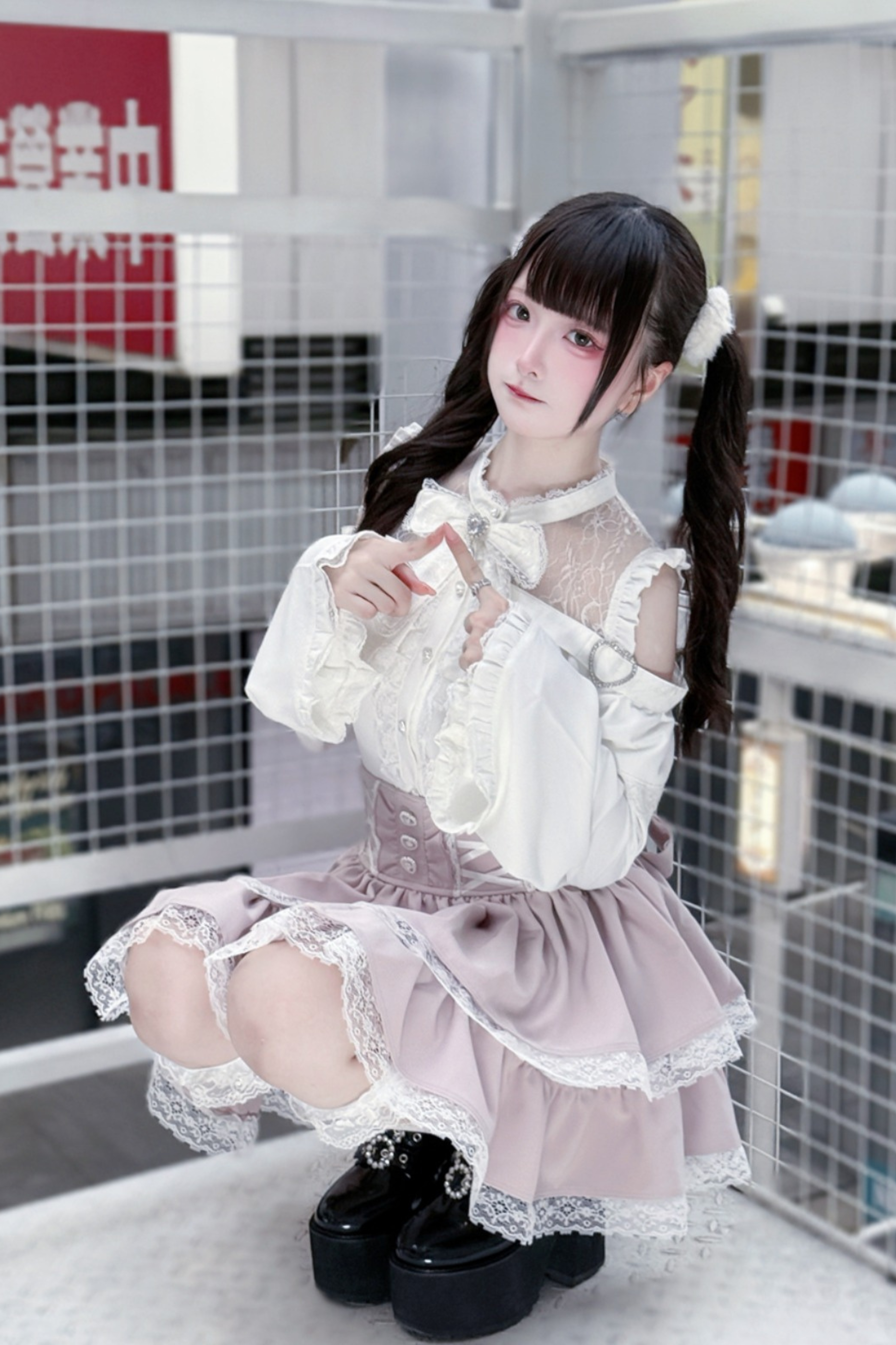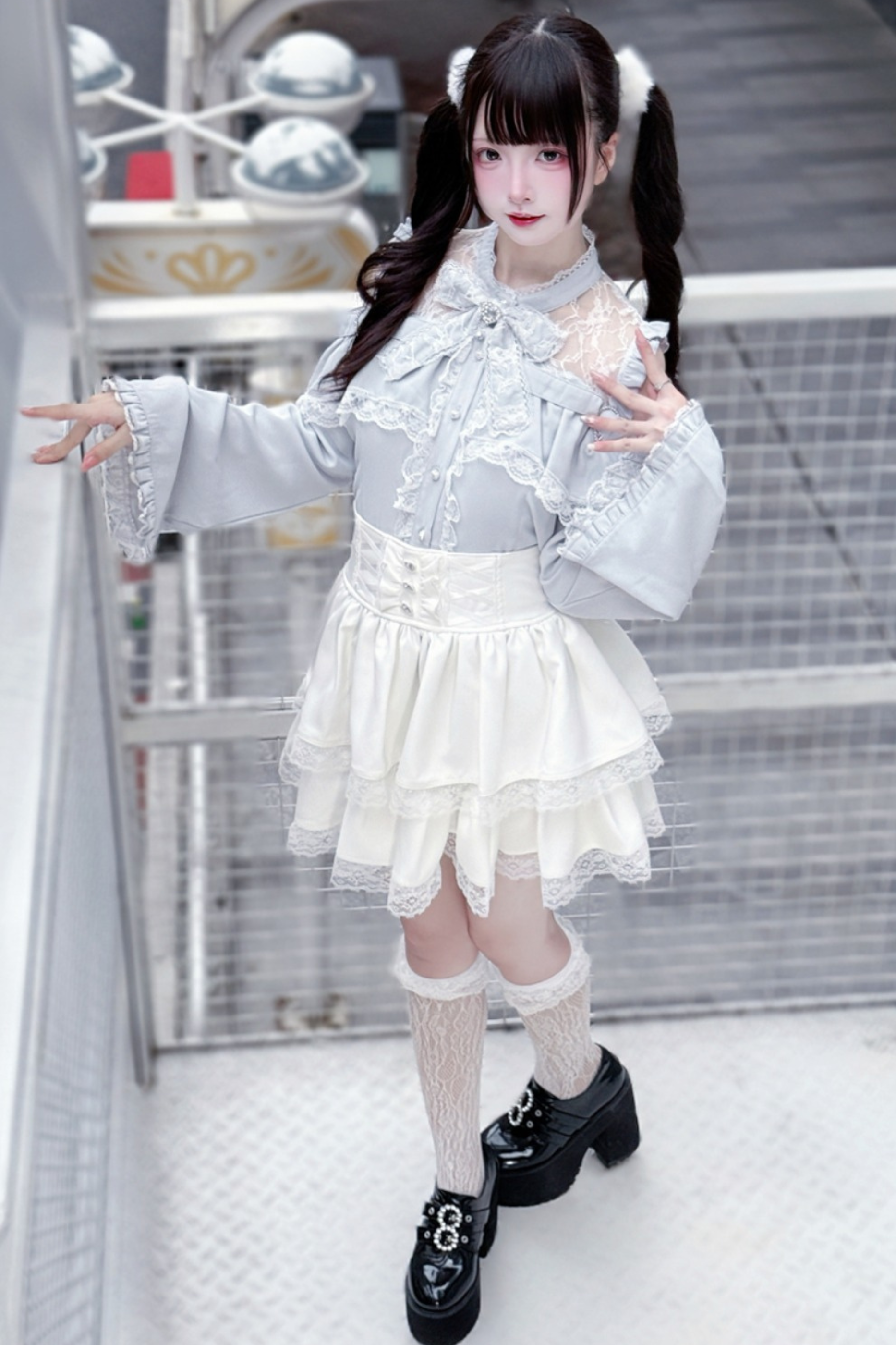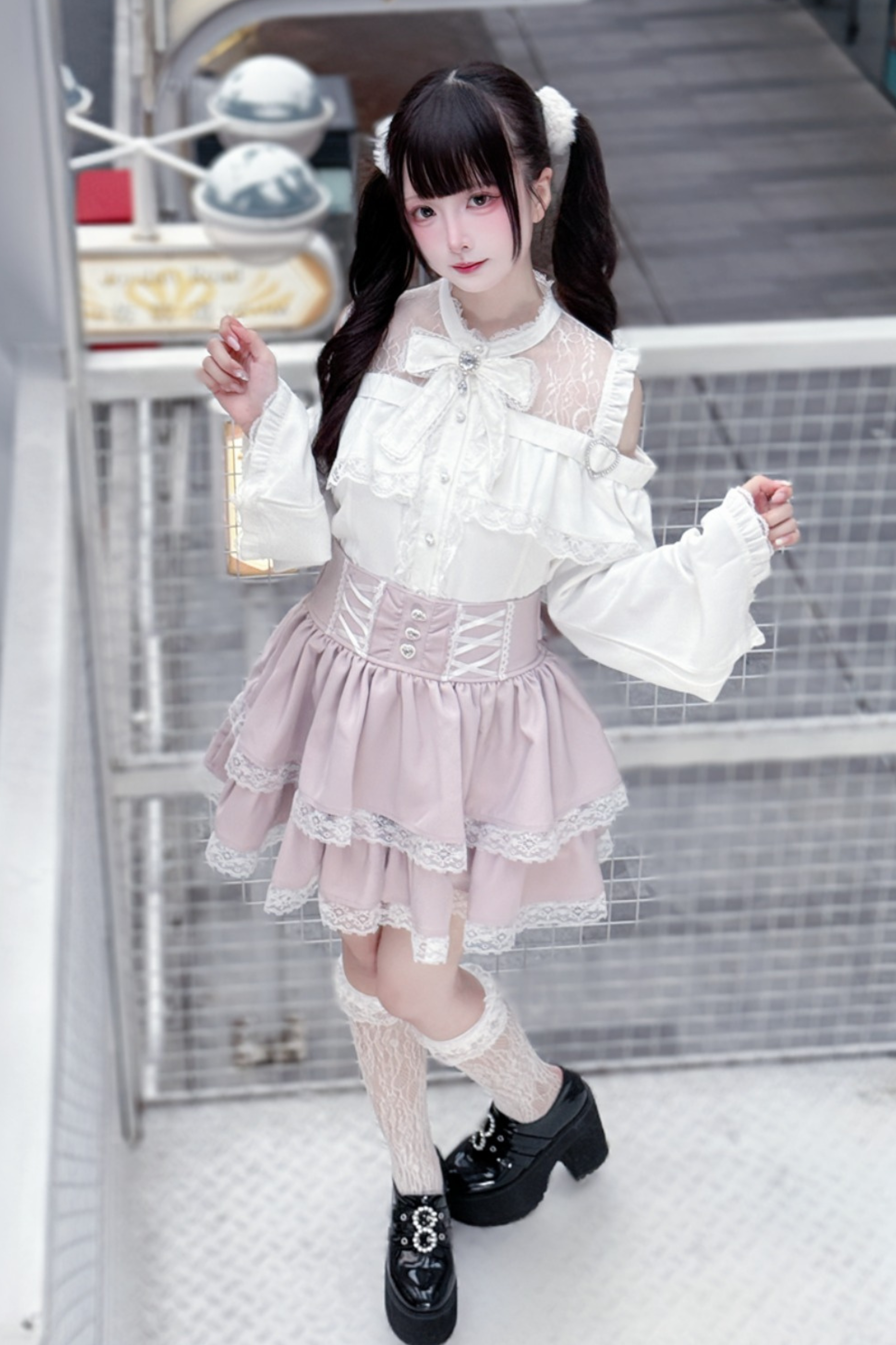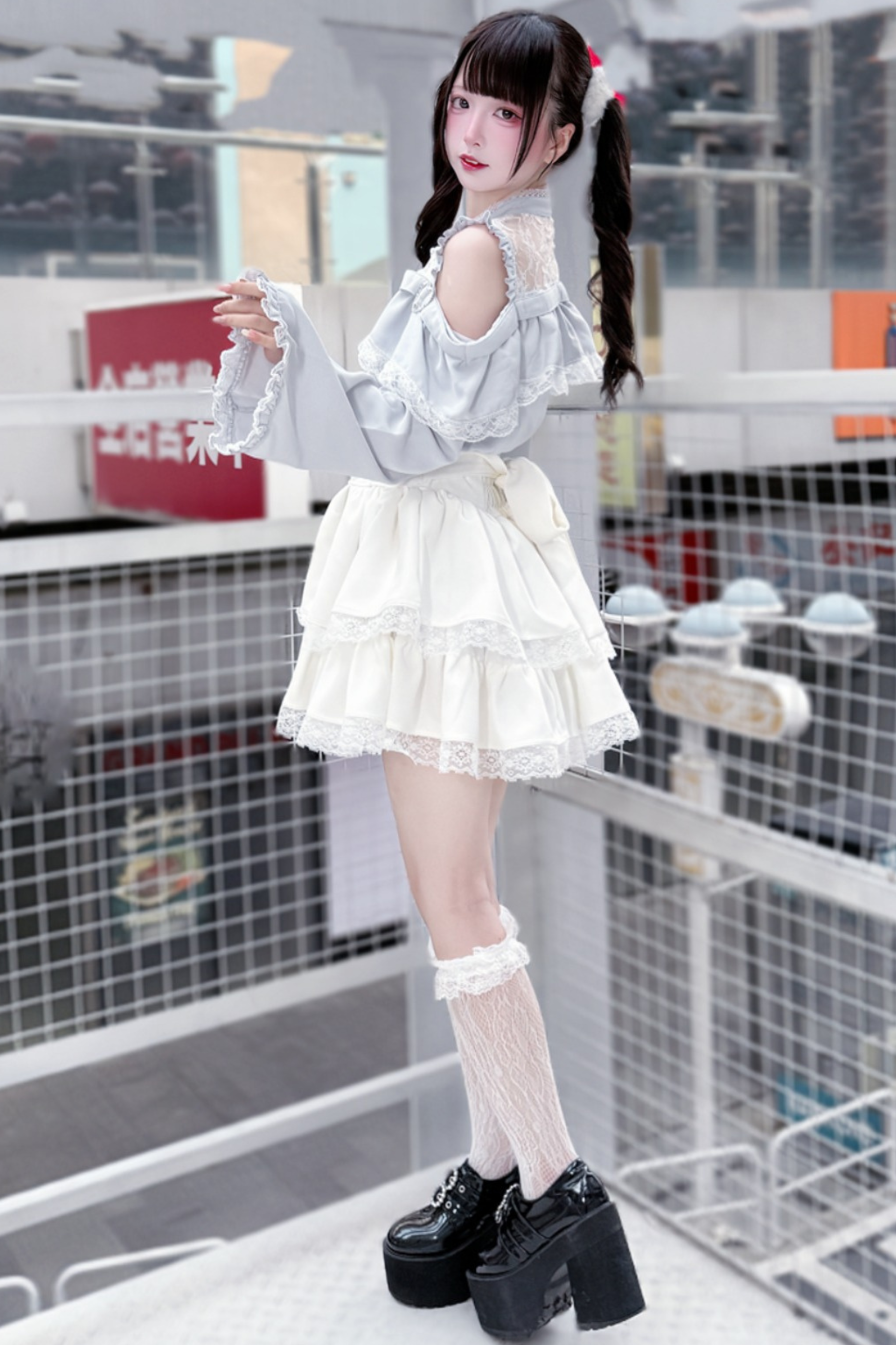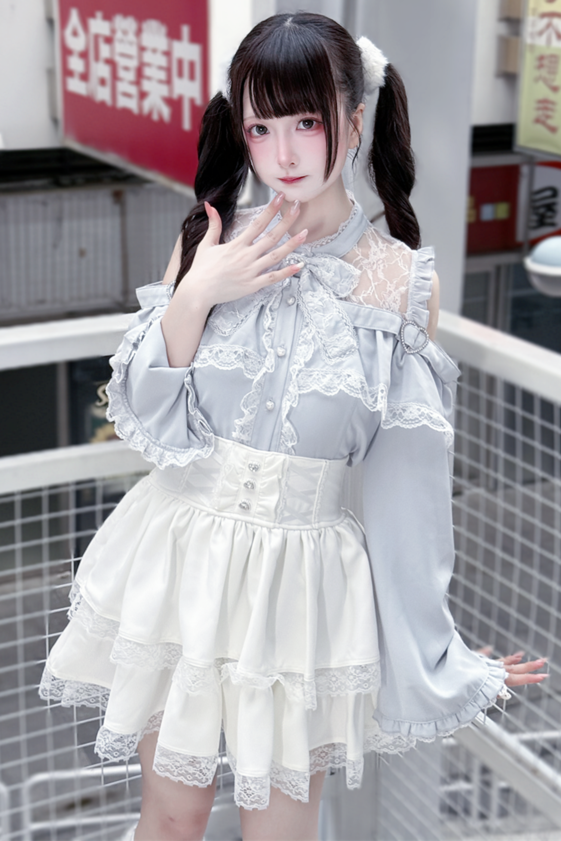 Lace off-the-shoulder shirt + lace-up skirt