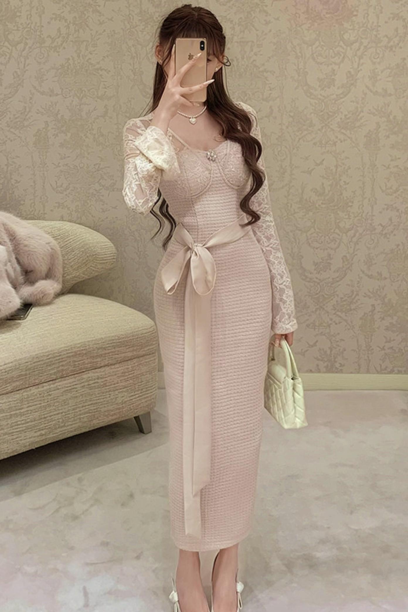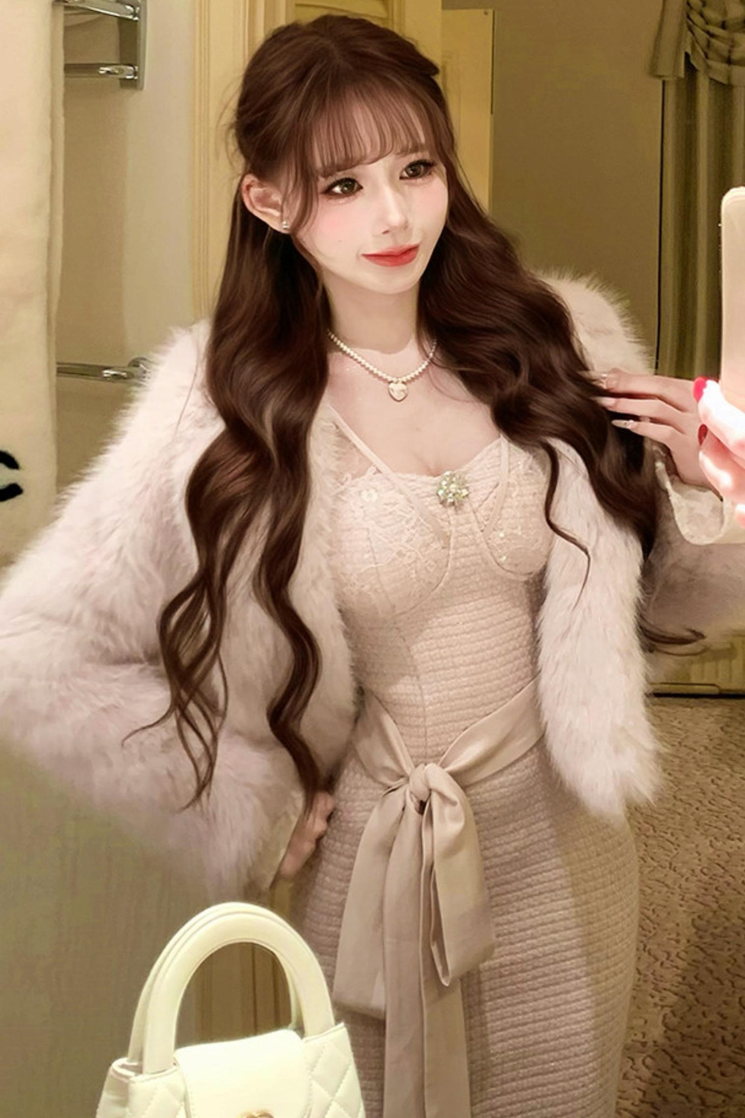 Lace Waist Slim Fit Dress + Fur Coat ❤