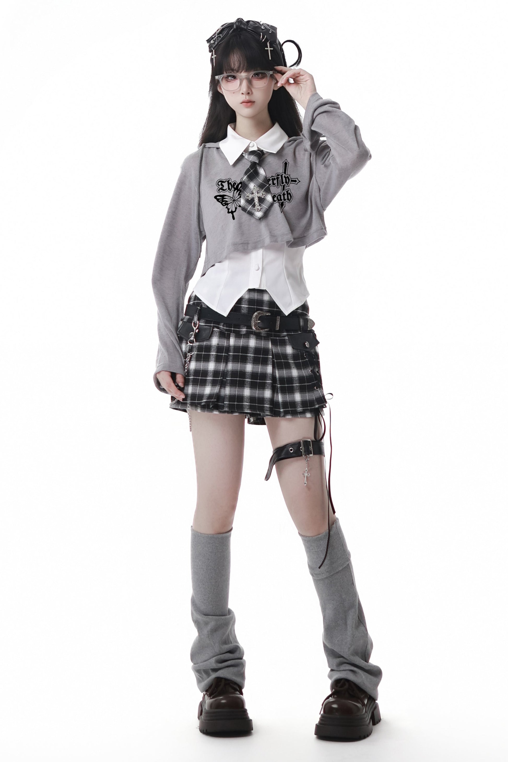 Y2K hooded short top + sleeveless shirt with tie + check culottes