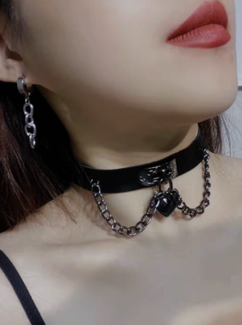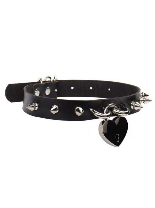 Leather Heart Padlock Chain Mine Choker