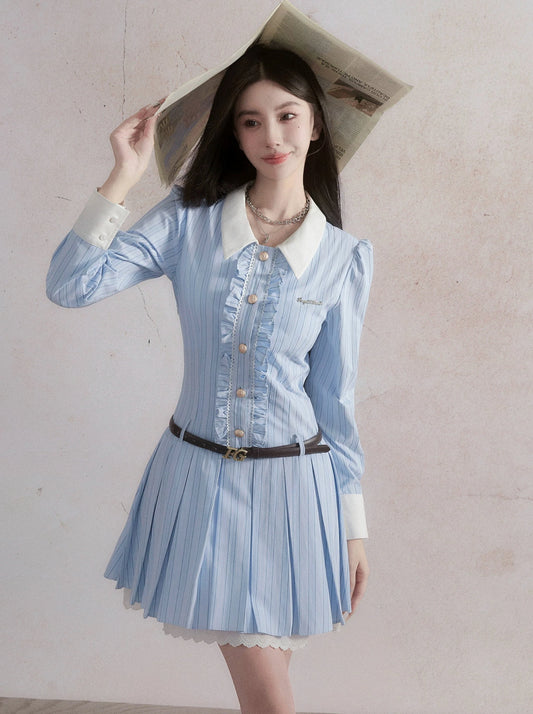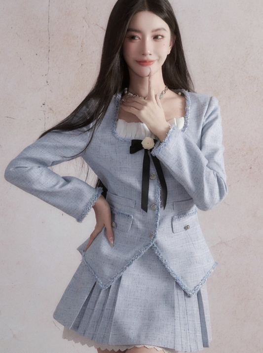 Blue Small Fragrance Jacket + Pleated Skirt