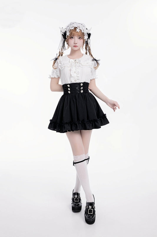 Solid color -Catpo T -shirt+short skirt+black pleats culott