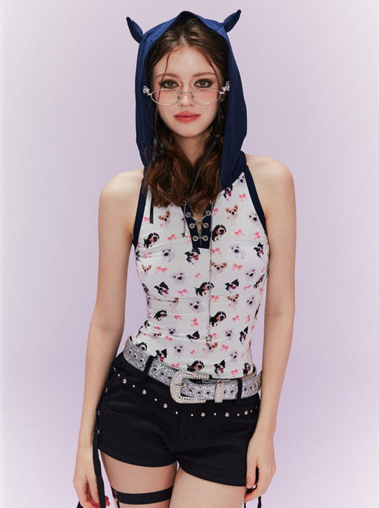 Dog Sleeveless Hooded Top + Side Ribbon Shorts