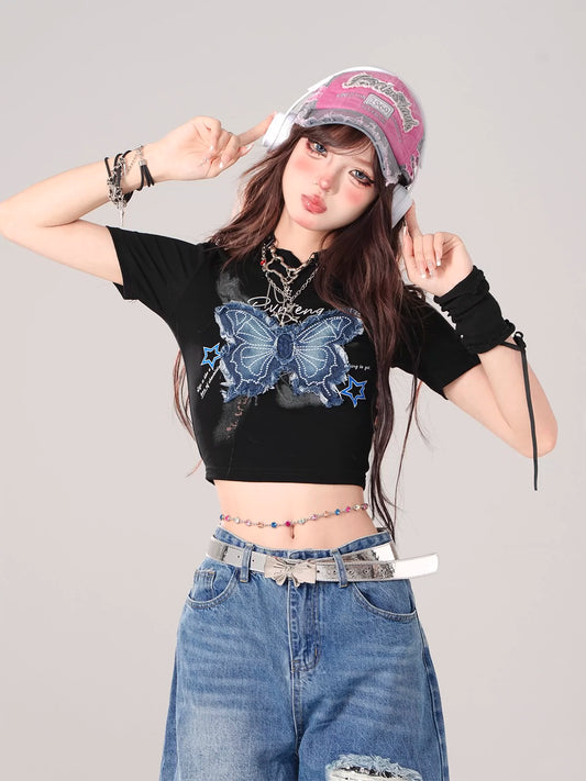 Black Pink Contrast Ribbon Slim Cropped T-Shirt
