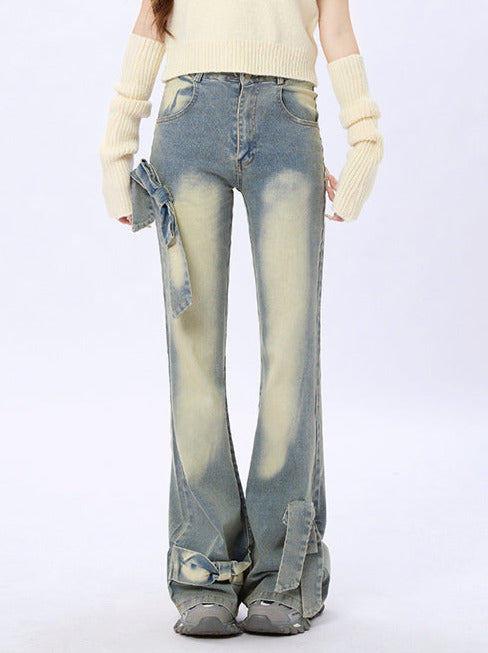 Ribbon design slim flare denim
