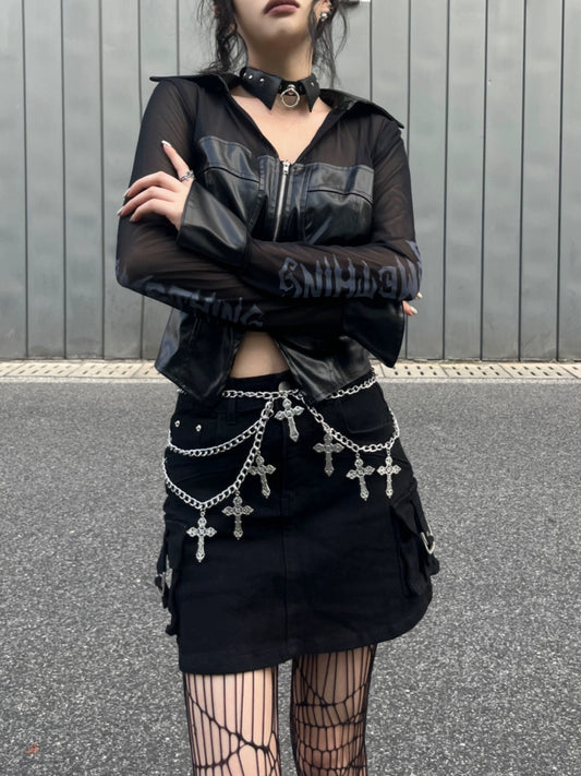 Punk Rock Black Leather Chain Pants In Pleated Skirt