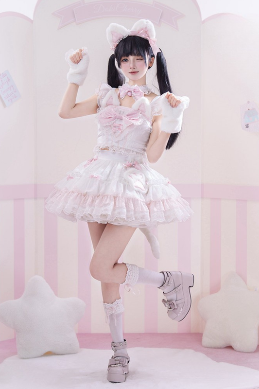 [Pre-order] Cat Girl Cat Ear Lace Ribbon Dress Full Set + Cat Ear Headband