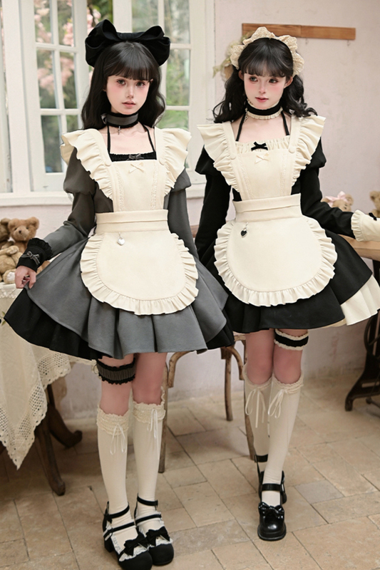 ツインフリルメイドロリータドレス+エプロン+チョーカー+ヘッドバンド+リボン+レッグカバー