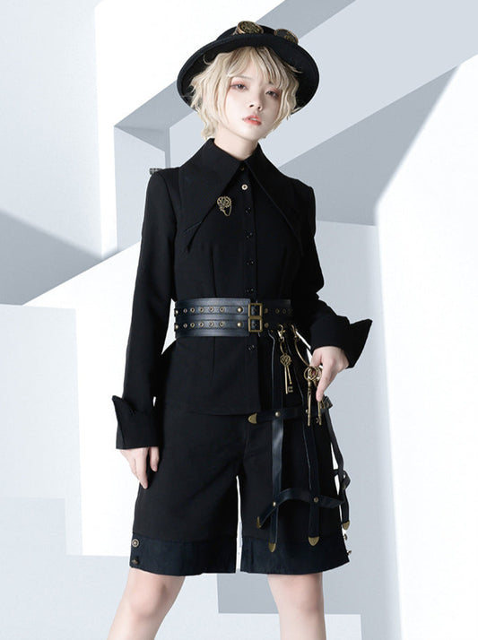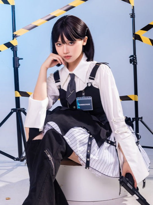 Strap slit sleeve shirt with tie + sass bustier + studded hem layered skirt with waist bag + asymmetric leg cover full set