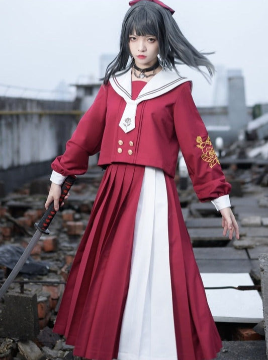 Rose Embroidery Tucked Sailor Top with Tie + Asymmetrical Color Pleated Skirt