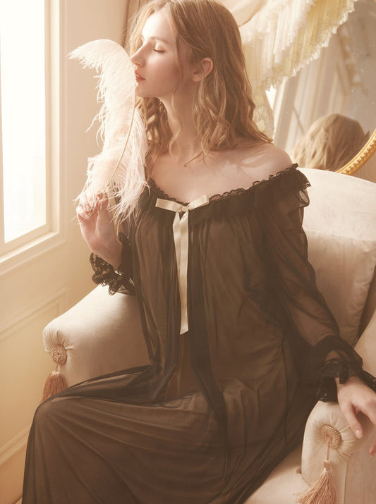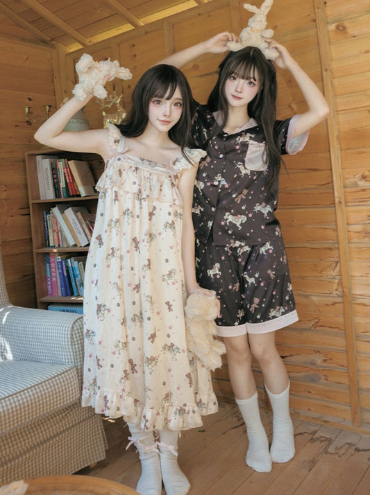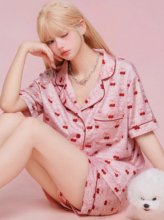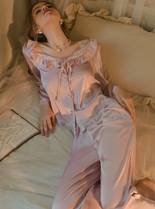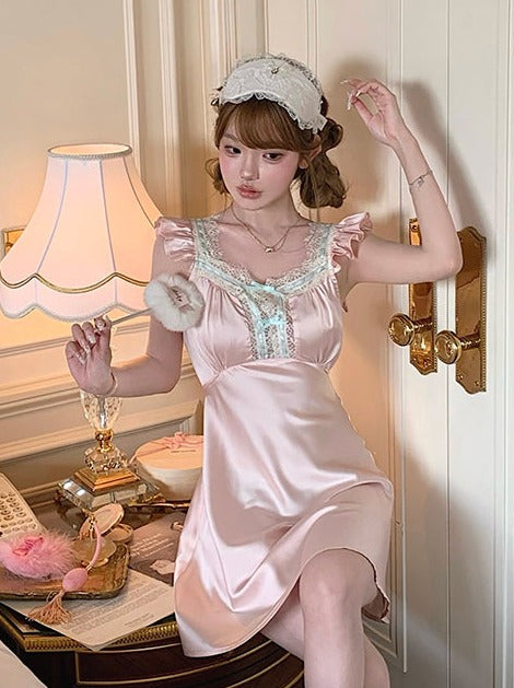 French Ice Silk Pajamaradies Summer Race Puff Sleeve Cute Girl Room Wear