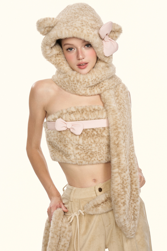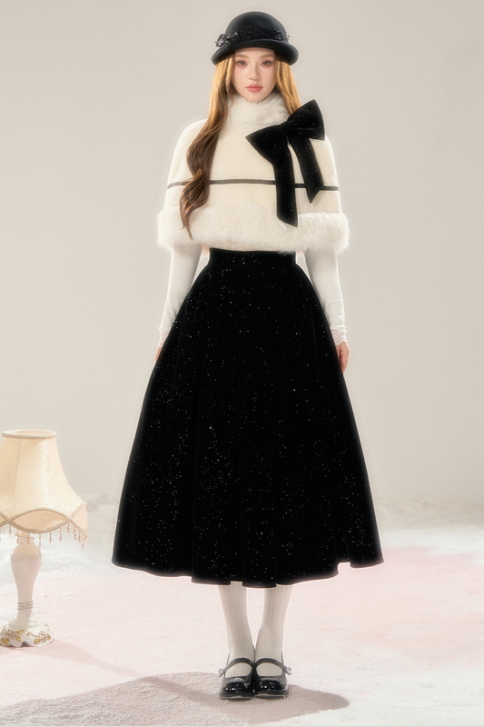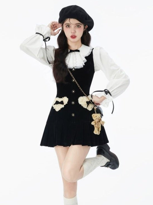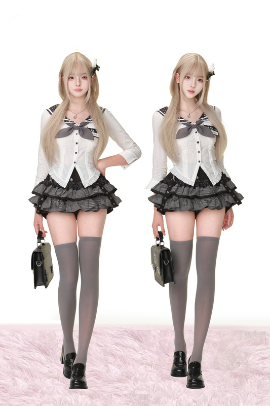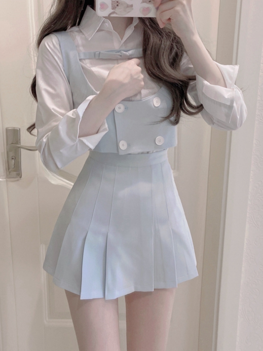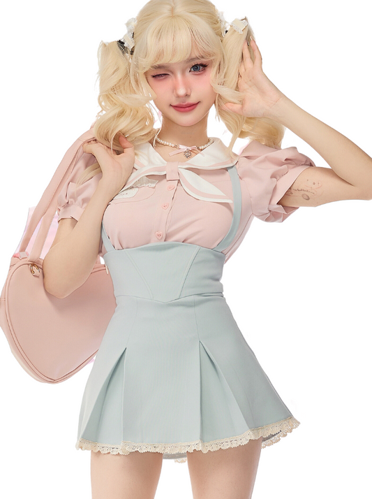 Matcha Roll Japanese Style Top + Kitten Suspender Skirt + Cape with Ribbon