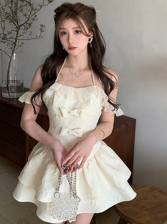 Dot puff sleeve different material Docking balloon dress + frill shorts setup