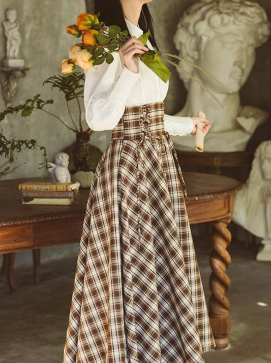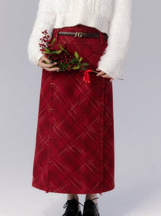 Retro dark red check long skirt + short skirt