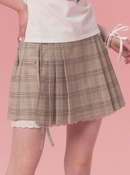Side lace up check flare skirt