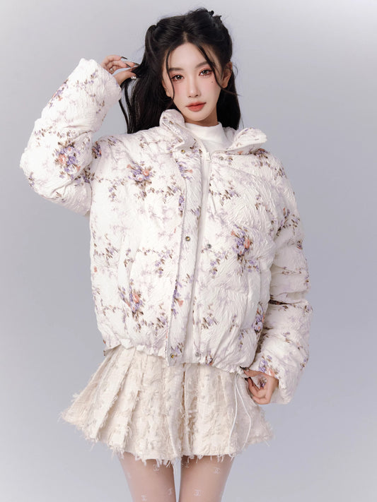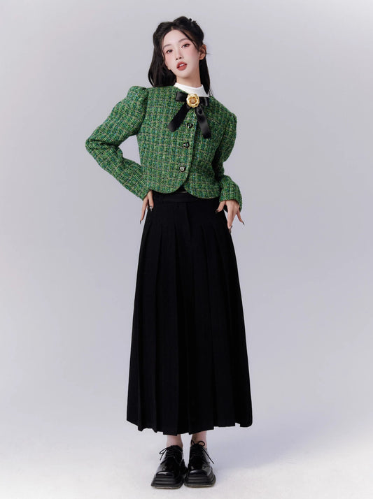Fragrance Flower Padded Jacquard Jacket + Pleated Skirt