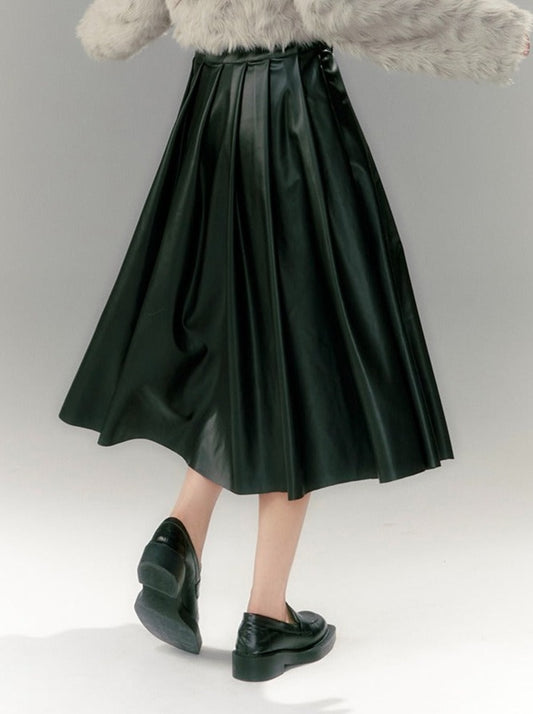 Chain Leather Long Pleated High Waist Skirt