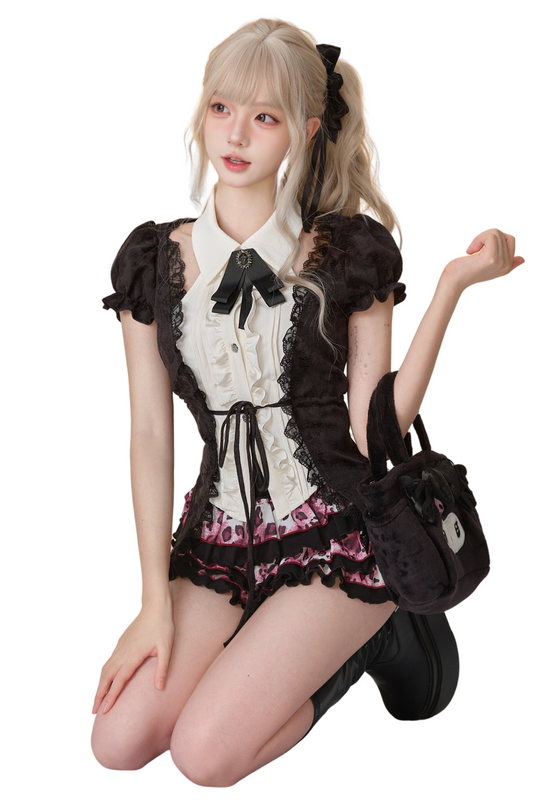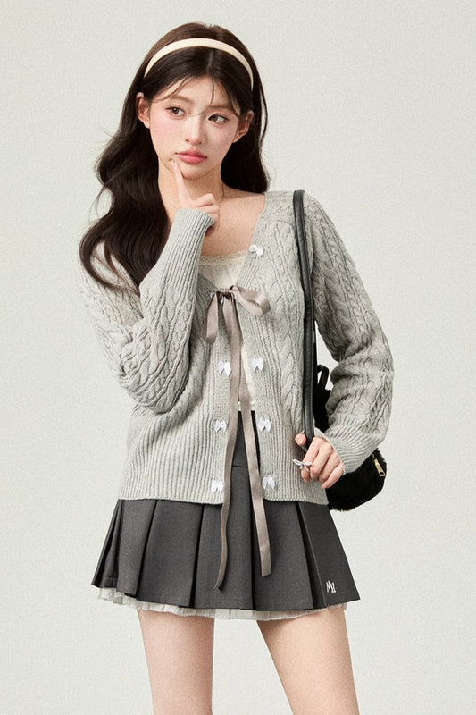 Bell Design Bow Knit Cardigan + Lace Pleated Skirt