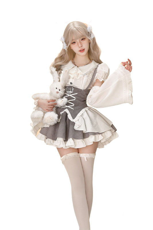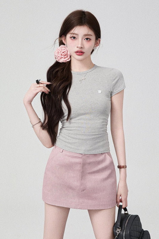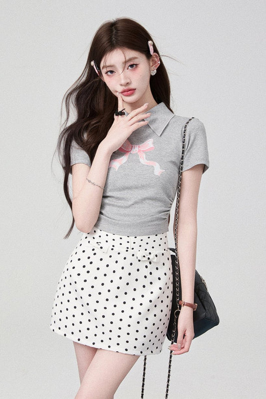 Korean White Waist Cinched Shirt + Gray Back Hip Skirt