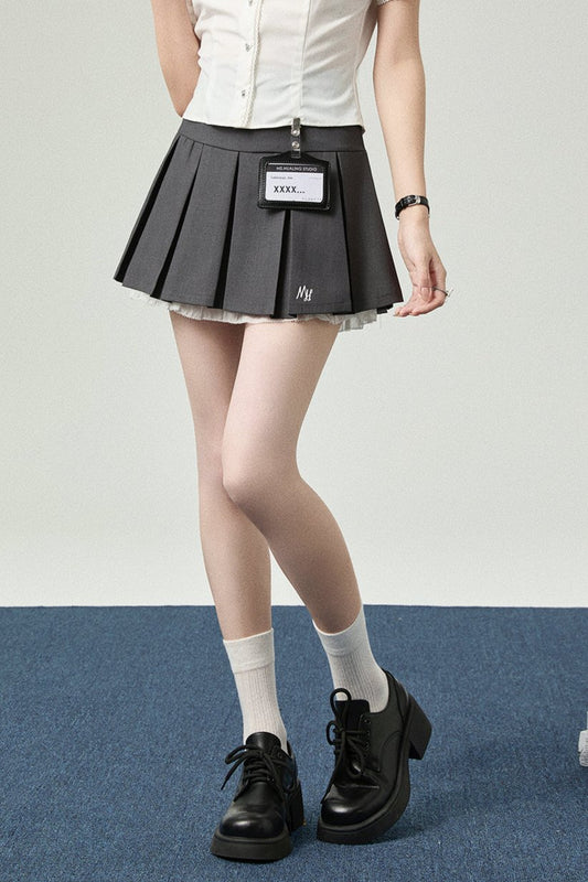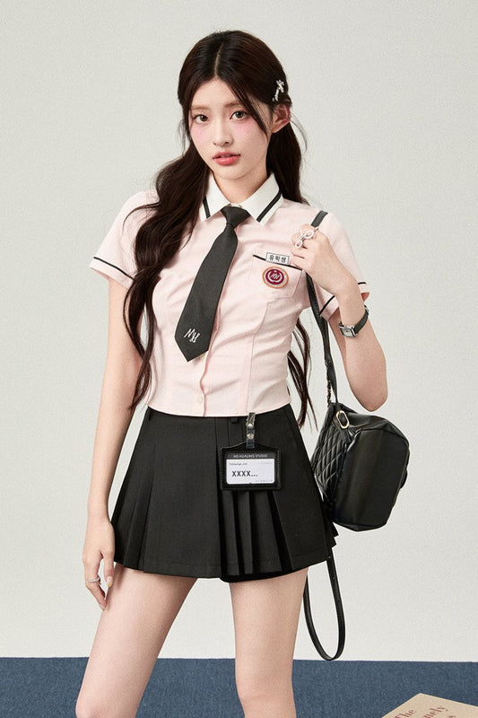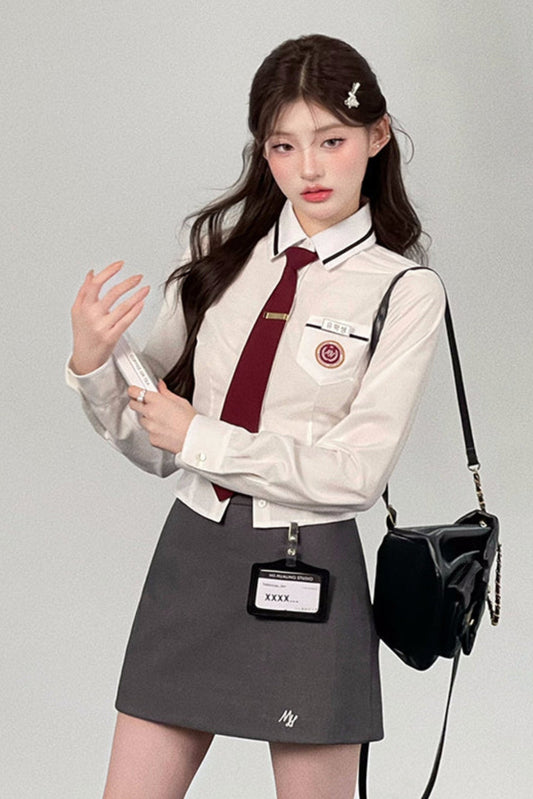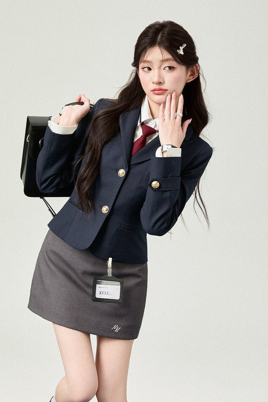 College Badge JK Blazer + White Shirt + Gray Hip Skirt