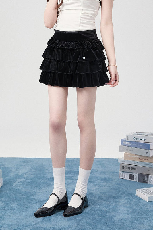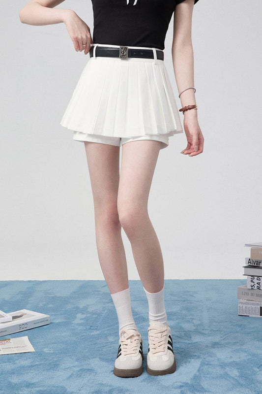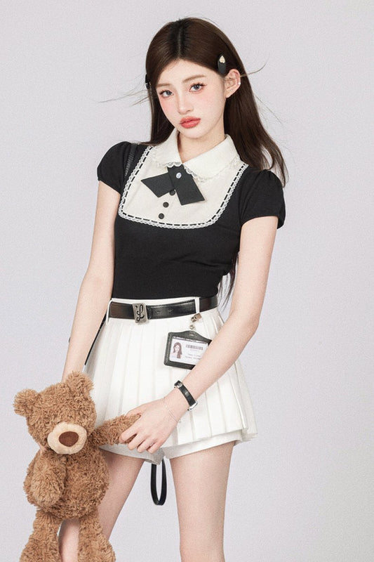 Solid color -Catpo T -shirt+short skirt+black pleats culott