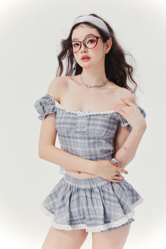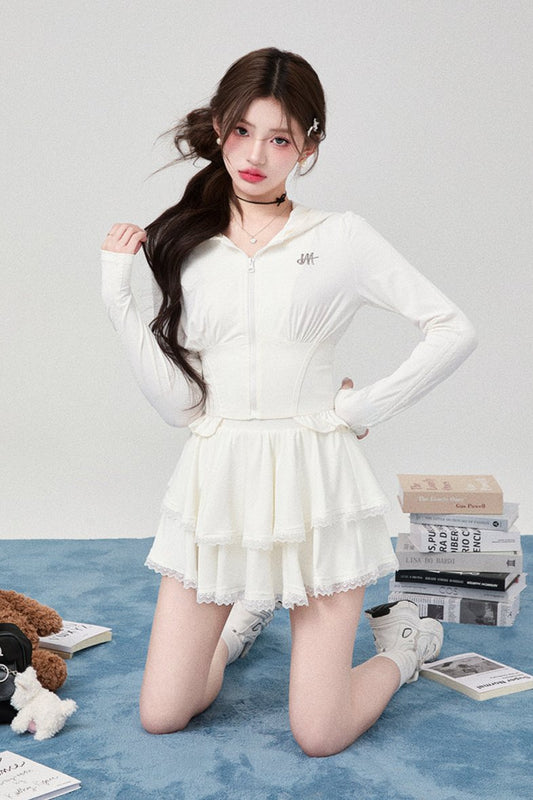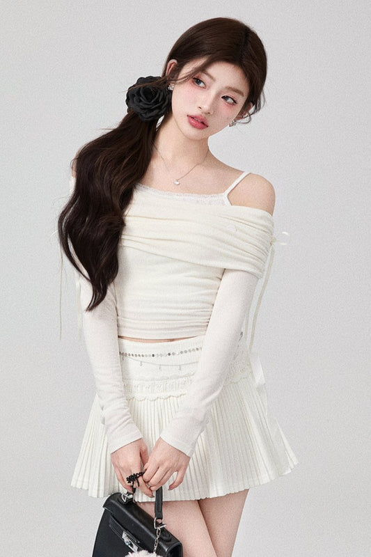 Bowan Shoulder Knit Tops + Pleated Skirt + Ribbon Cake Skirt