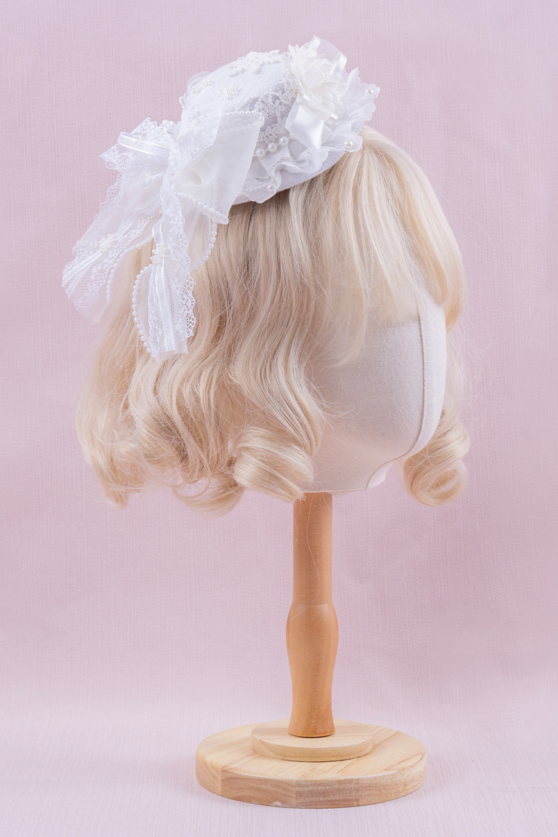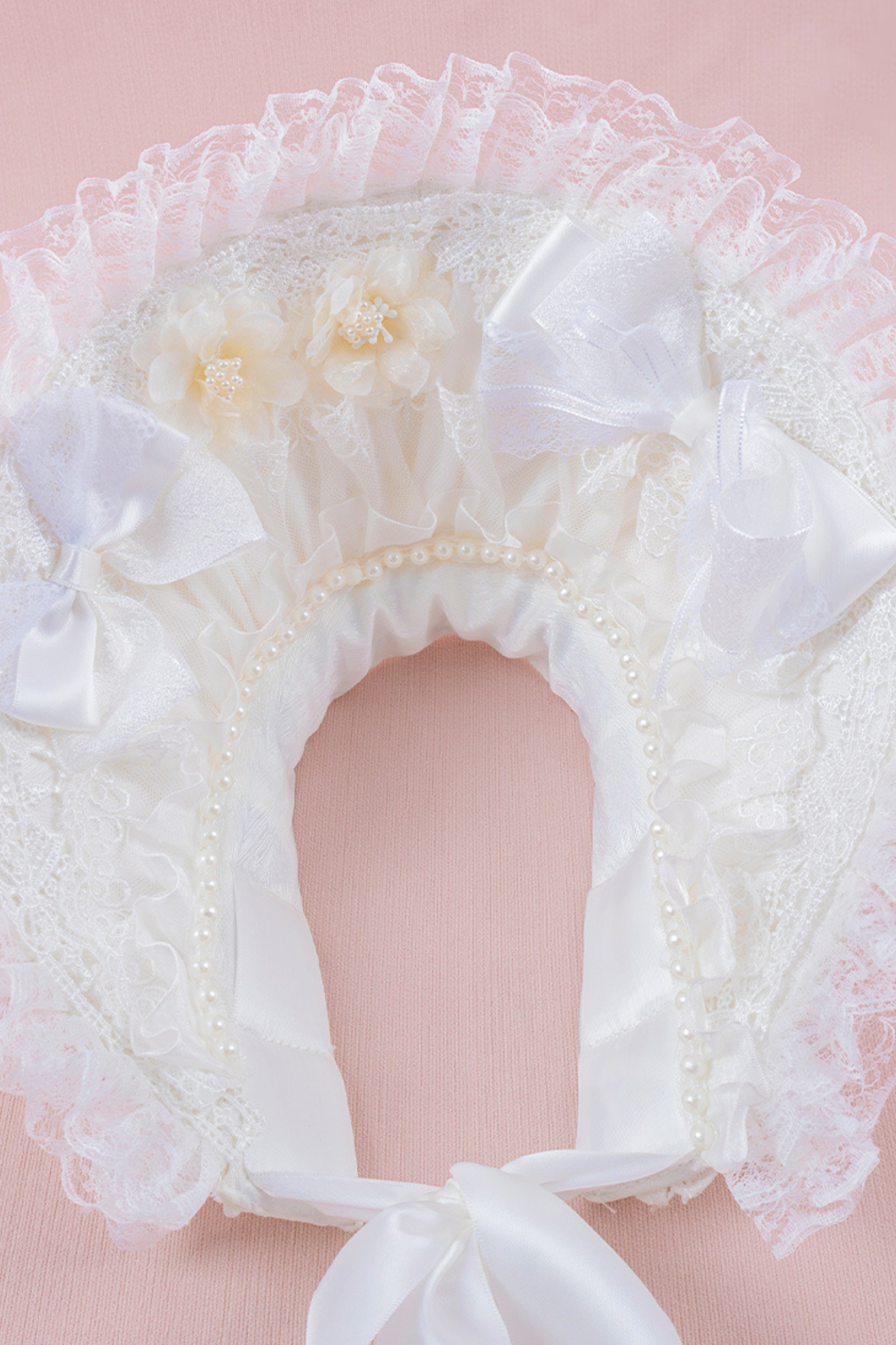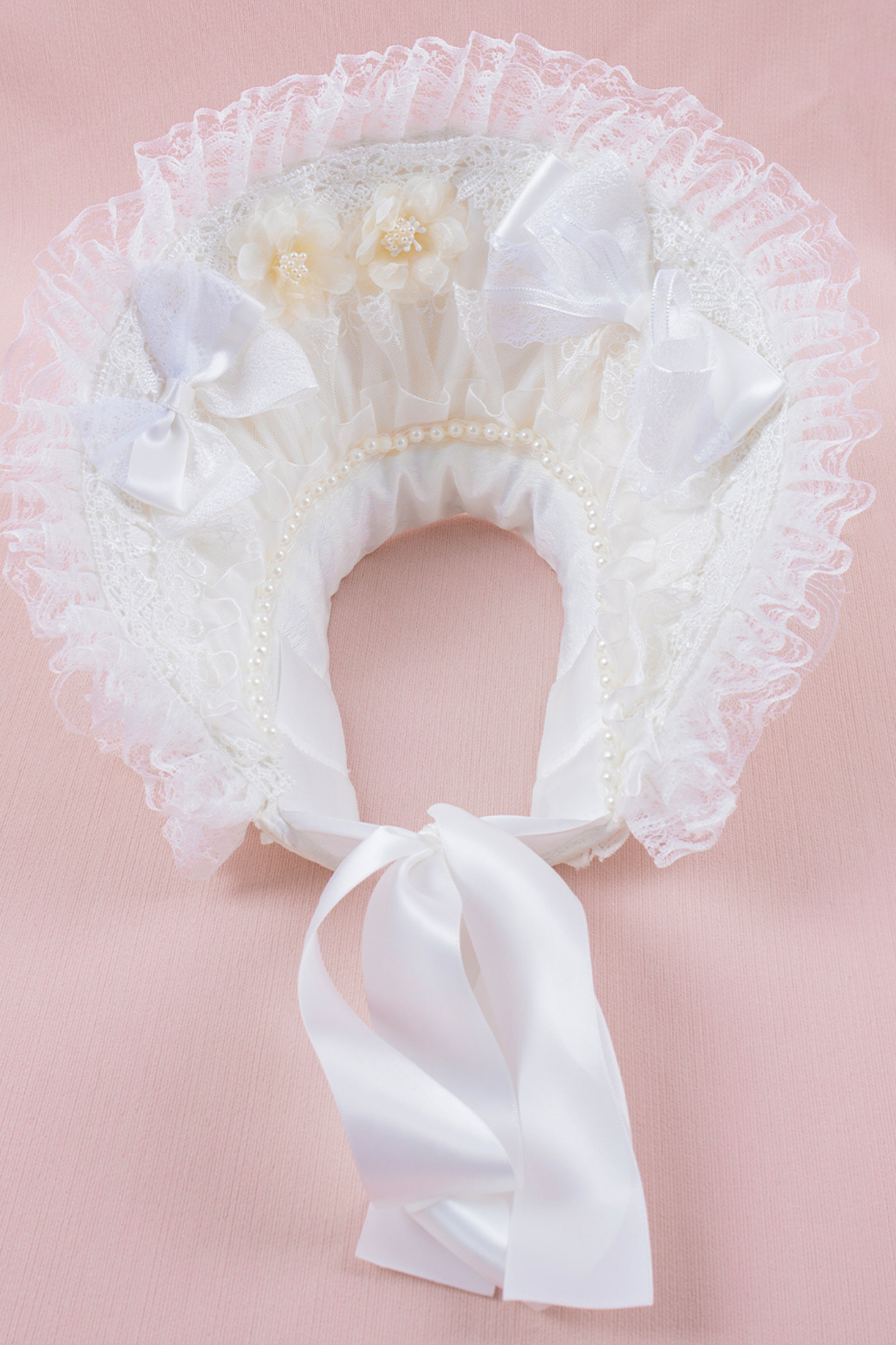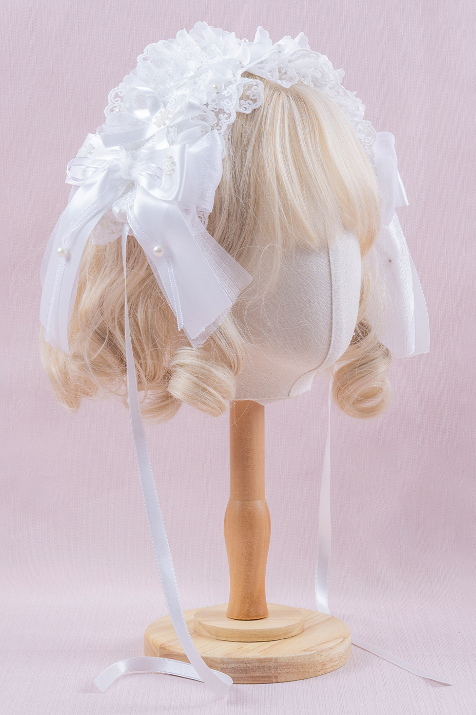 ホワイトレースブライダルスタイルボンネット+ヘアバンド+クリップ+スリーブ