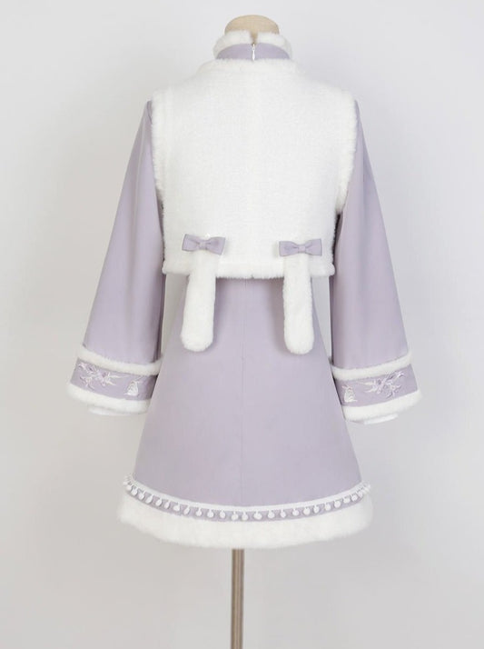 Rabbit ear tassel ribbon fur vest + rabbit embroidered china dress