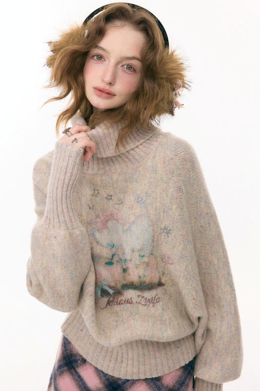 Cat Print Turtleneck Sweater