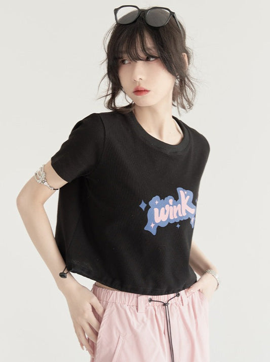 Print Ribbon Puff Sleeve Cropped T -shirt + Blue Draping Pants