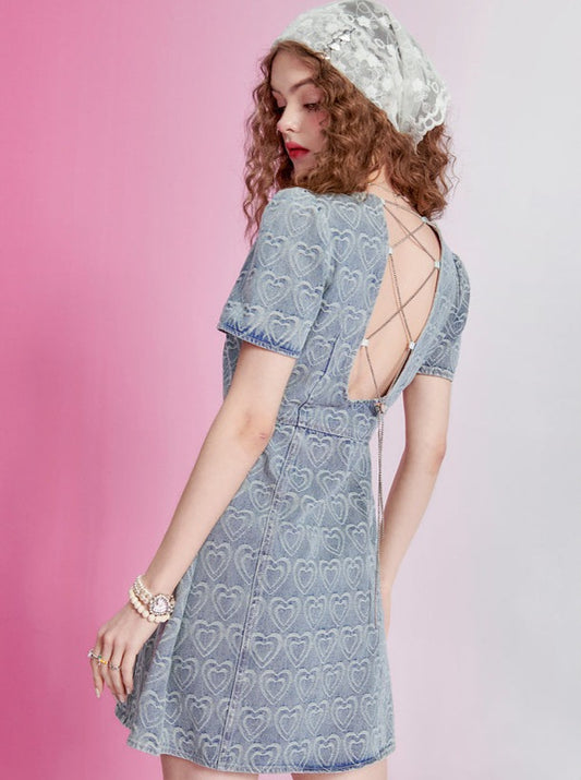 Blue Ming Square Collar Open Back Jacquard Denim Dress