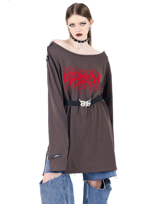 Cool Buckle Shoulder & Belt Side Zip Thorn Letter Print Long T