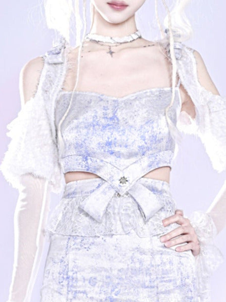 Y2K Millennium Marble Off-Shoulder Halter Neck Puff Sleeve Top + Arm Covers