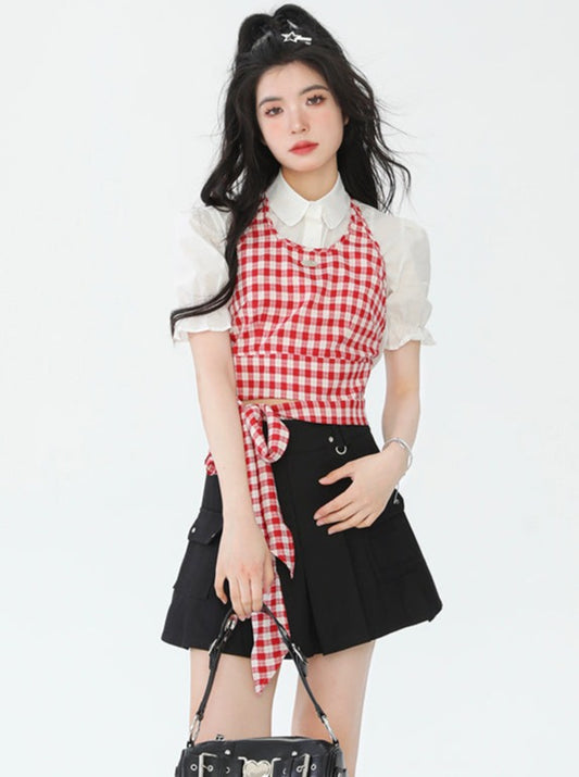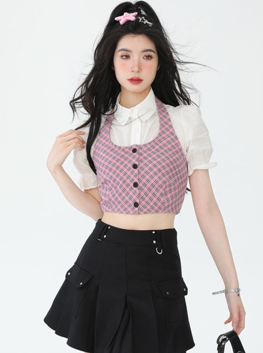 French sweet check + puff sleeve shirt