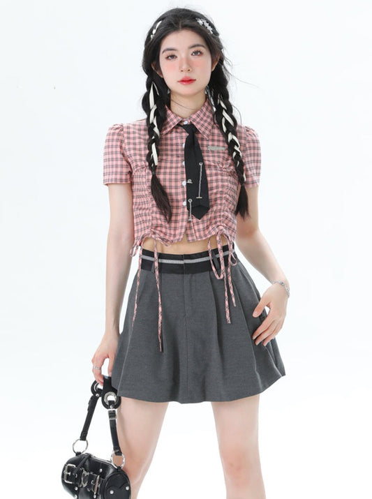 Black Pink Uniform Coordinating Shirt & Check Tie Lace-up Pleated Sass Skirt Setup [Box Pleats/Plain Pleats]