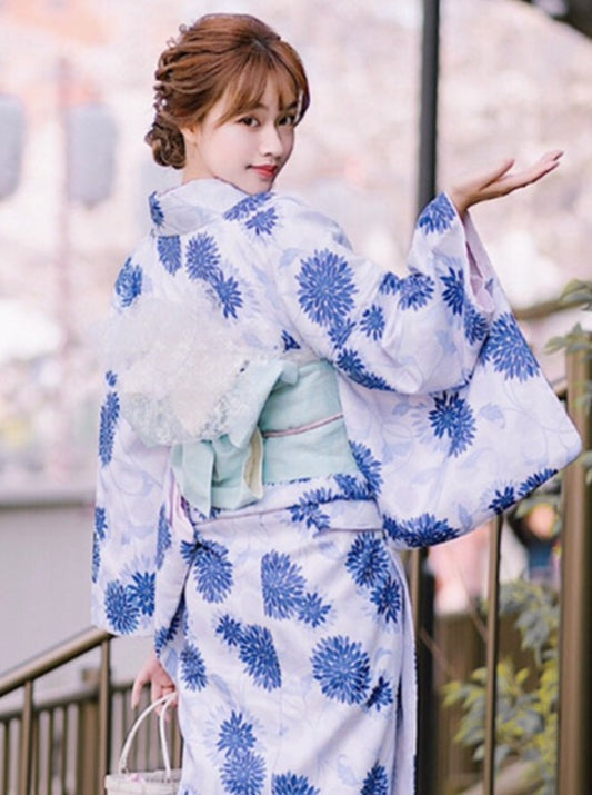 Neat white x blue flower total lace yukata set [kimono + handbag + tabi]