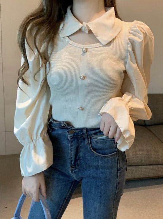 Palace Bubble Princess Sleeve Flower Lace Pearl Sea through Tops