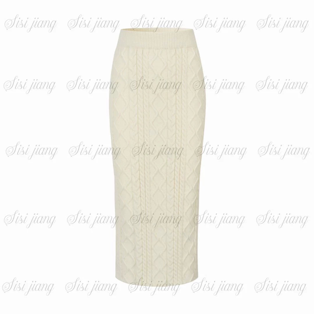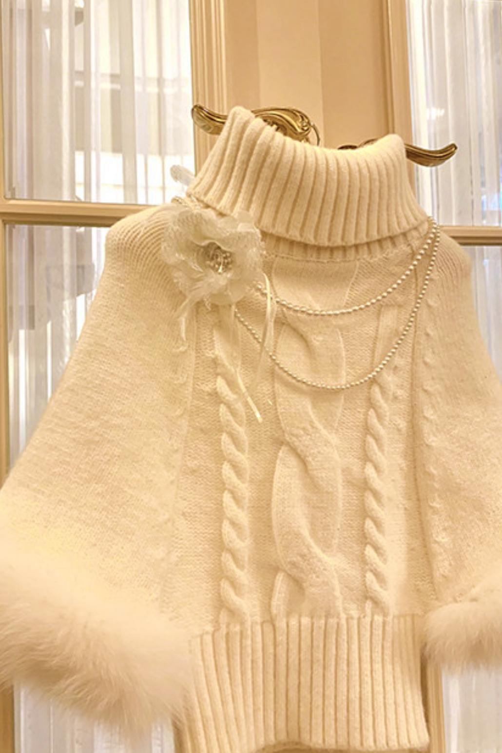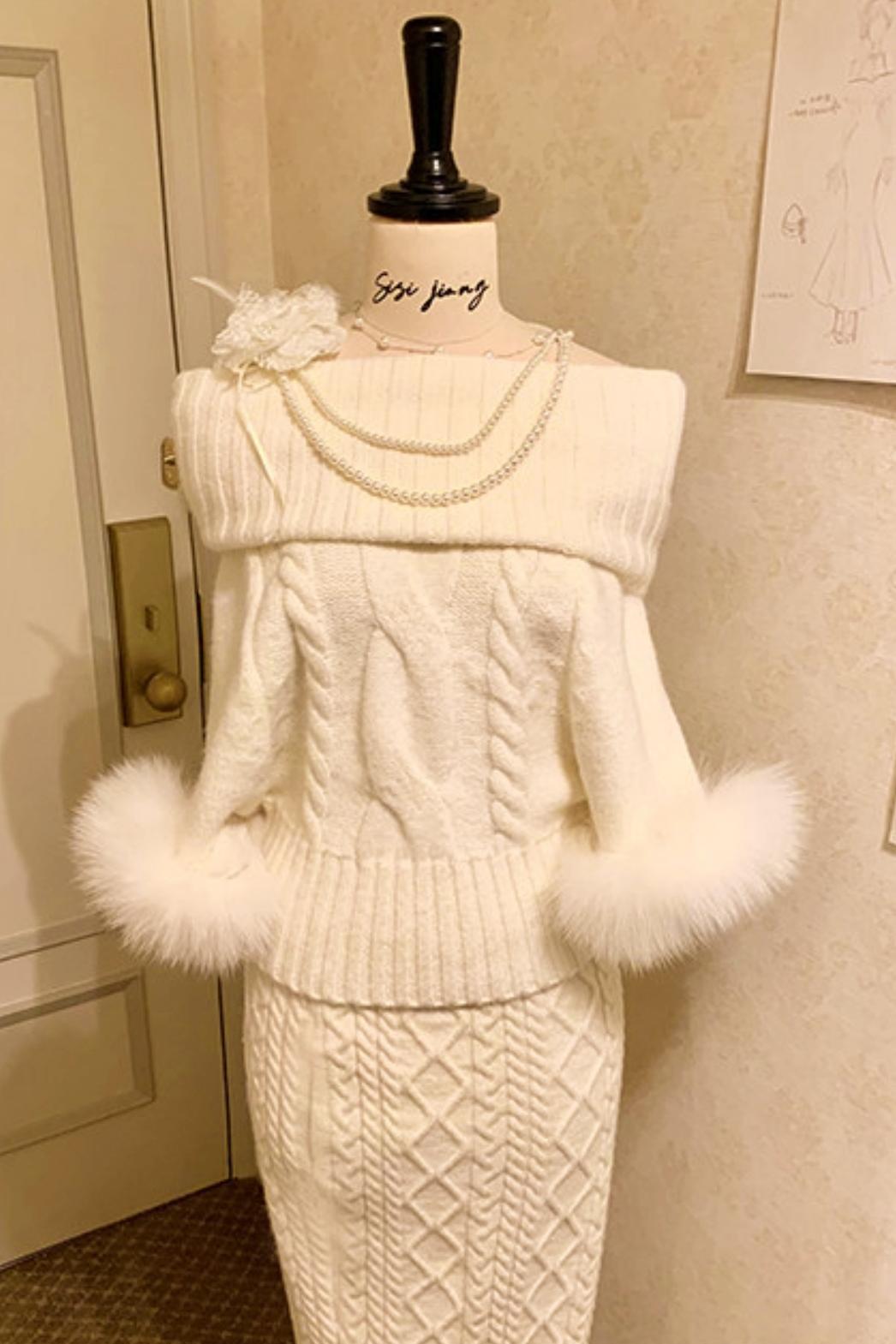 ❤Fox Fur Trim Cape Sweater + Twisted Knit Bodycon Skirt