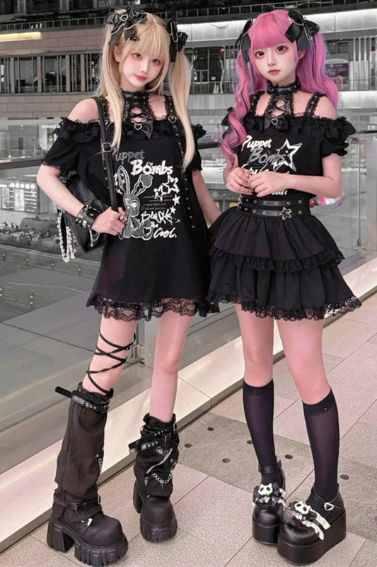 T-shirt Dark Kawaii à lacets + jupe + sac + accessoires cheveux