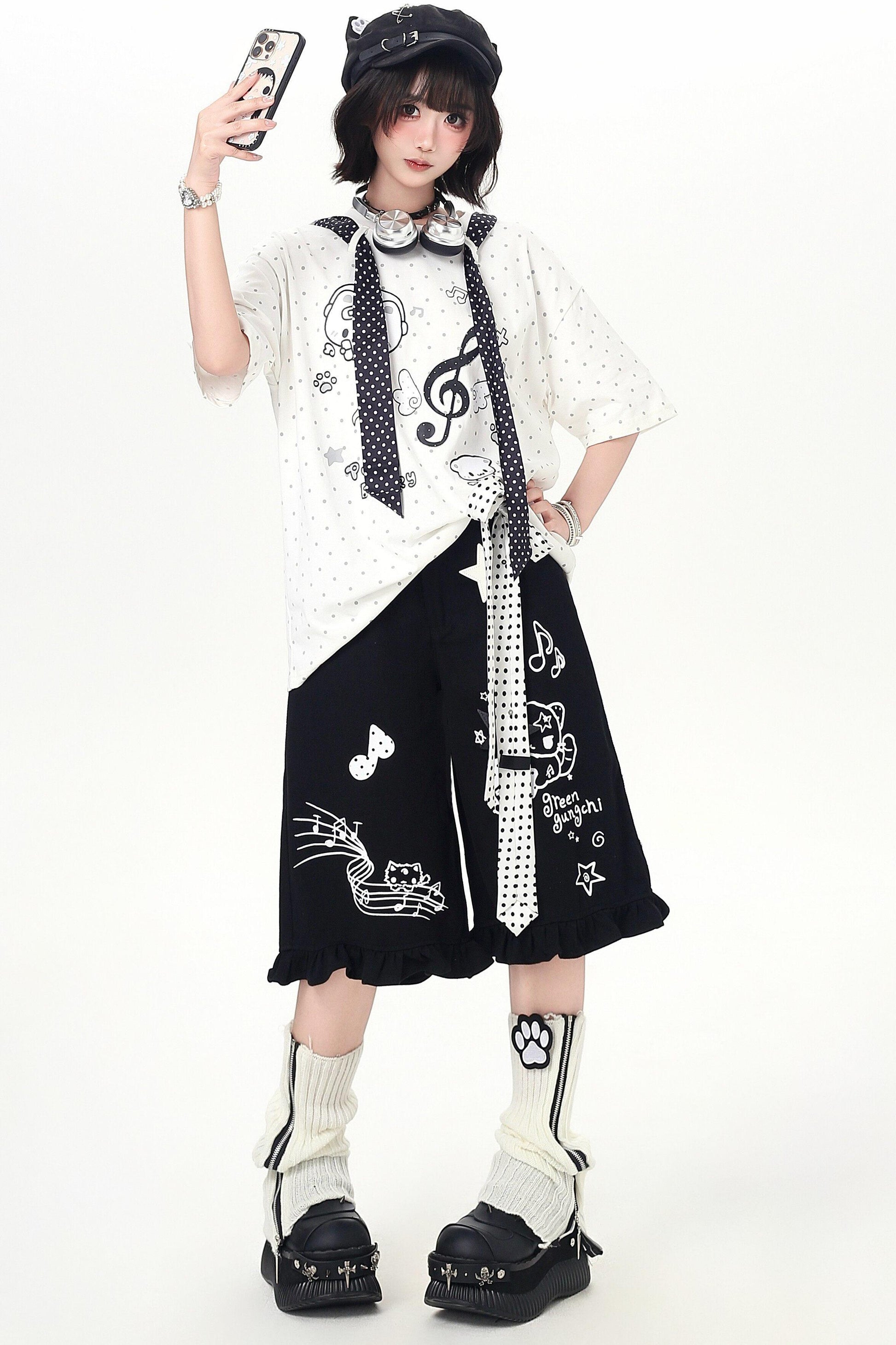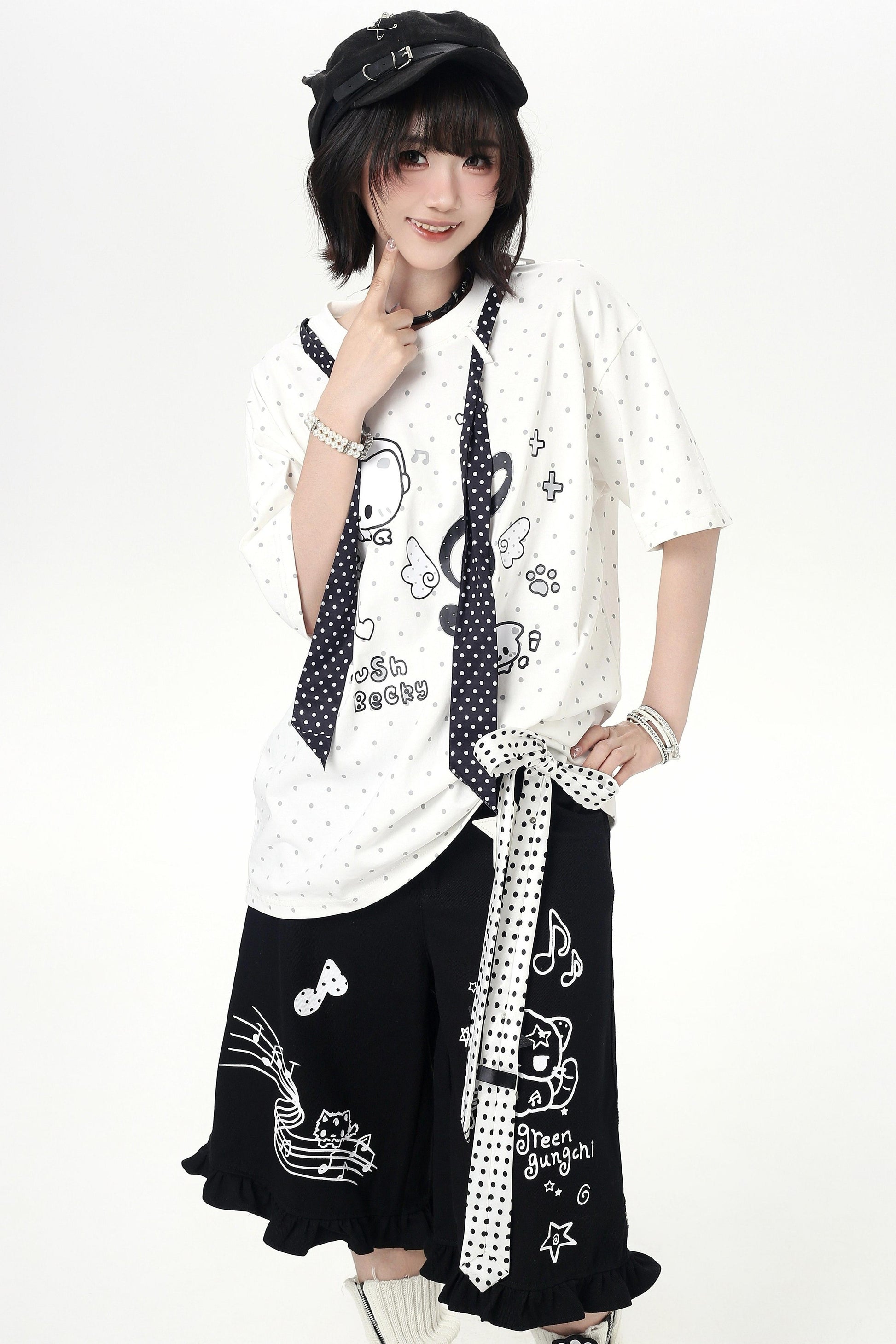 ❤Short à volants, à pois, avec ruban et motif graphique de dessin animé❤